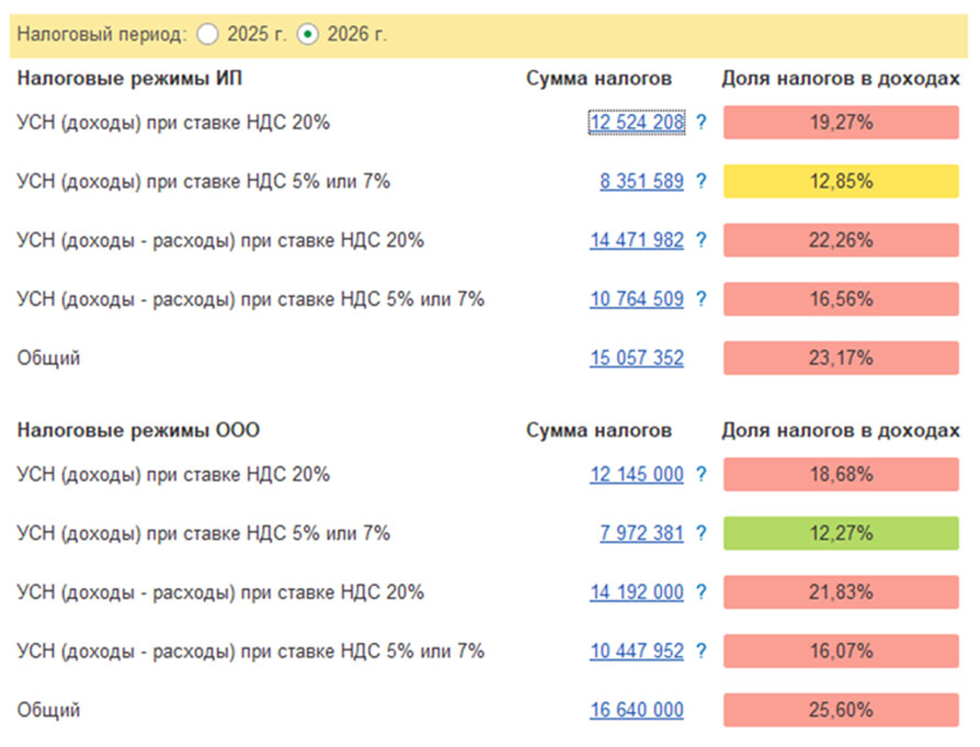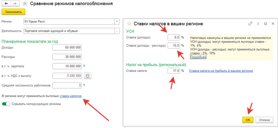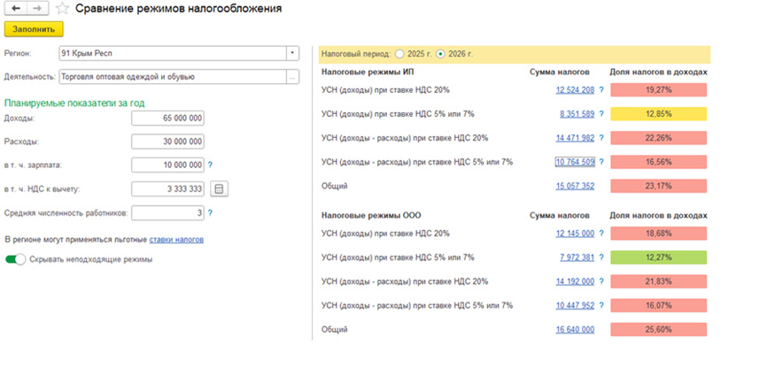 В программе 1С:Бухгалтерия есть встроенный сервис «Сравнение режимов налогообложения».