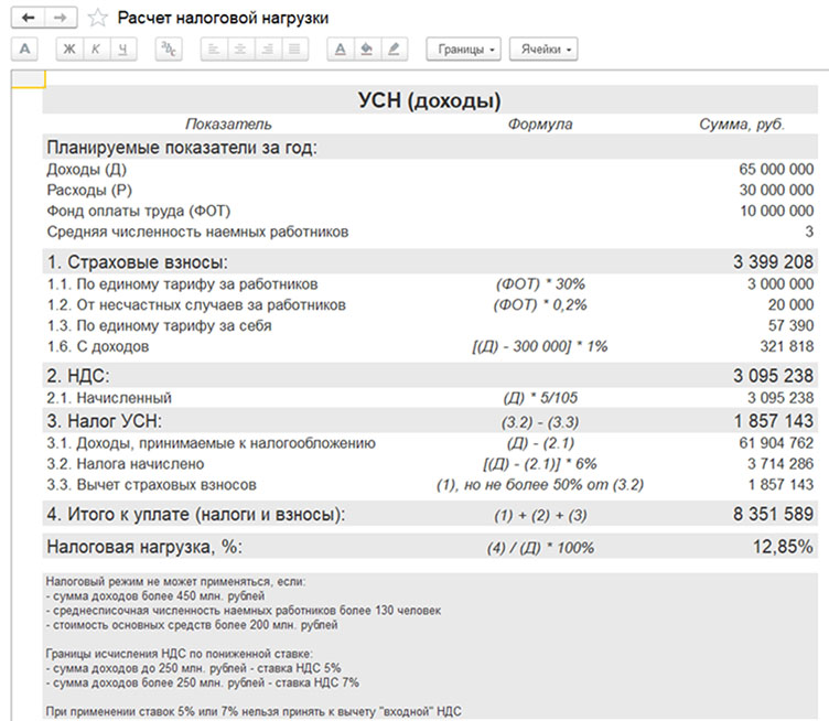 Если 1С:Бухгалтерии нет, Вы можете оформить тестовый доступ к программам «1С» сроком на 1 месяц в сервисе 1С:Фреш, ввести все нужные данные и получить расчет предполагаемой налоговой нагрузки.