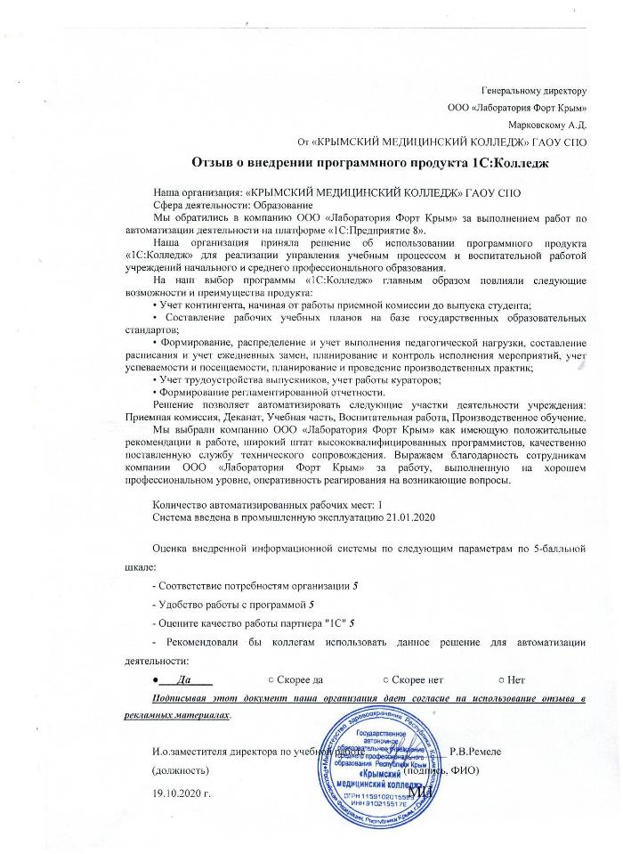 Мы обратились в компанию ООО «Лаборатория Форт Крым» за выполнением работ по автоматизации деятельности на платформе «1С:Предприятие 8». Наша организация приняла решение об использовании программного продукта «1C:Колледж» для реализации управления учебным процессом и воспитательной работой учреждений начального и среднего профессионального образования. На наш выбор программы «1C:Колледж» главным образом повлияли следующие возможности и преимущества продукта: