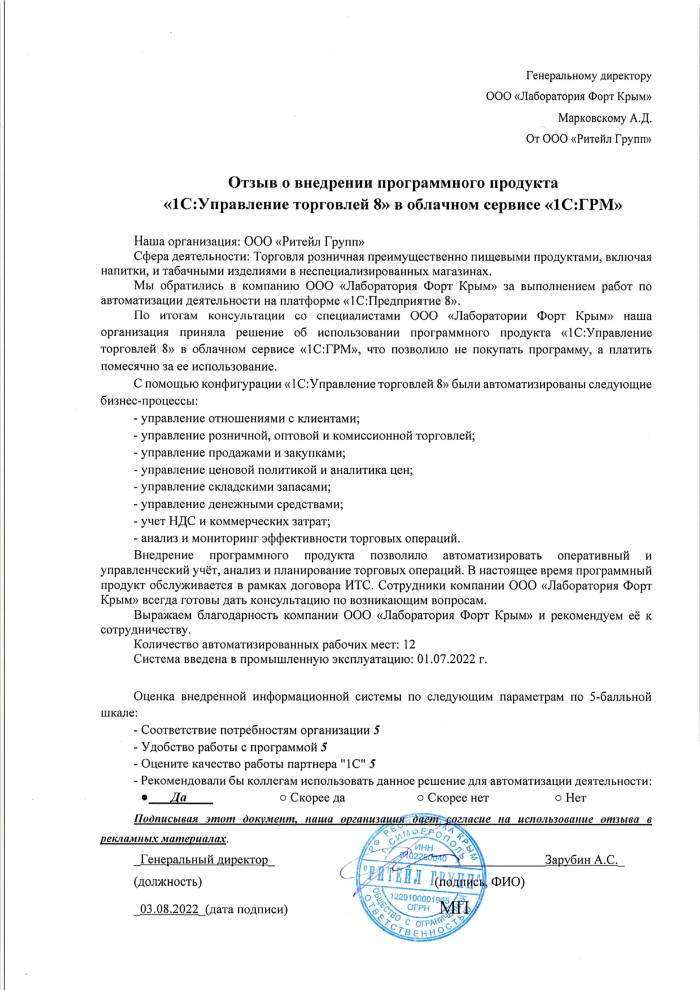 Обратились в компанию ООО «Лаборатория Форт Крым». Сотрудники компании изучили бизнес-процессы и провели качественные консультации, по итогам которых было принято решение использовать программный продукт «1С:Управление торговлей 8» в облачном сервисе «1С:ГРМ», что позволило не приобретать дорогостоящие компьютеры и избавило от потребности установки программ на рабочие места. Уже через несколько дней ООО «Ритейл Групп» начало использовать программу «1С:Управление торговлей 8» в работе.