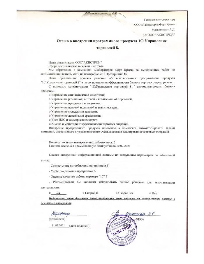 Благодаря новой системе учета в разы сократились ручные операции, так как все необходимые документы теперь быстро формируются в программе. Компания ООО «Акистрой» выражает благодарность за выполненные работы и рекомендует продукты "1С" к использованию.