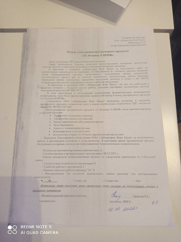 Индивидуальный предприниматель обратилась в компанию ООО «Лаборатория Форт Крым». Сотрудник компании провел консультацию и подобрал программный продукт – «1С:Розница 8. ПРОФ». Специалистами ООО «Лаборатория Форт Крым» была выполнена установка программного продукта и его начальная настройка, подключено торговое оборудование, настроен обмен с ИС МОТП и ЕГАИС.