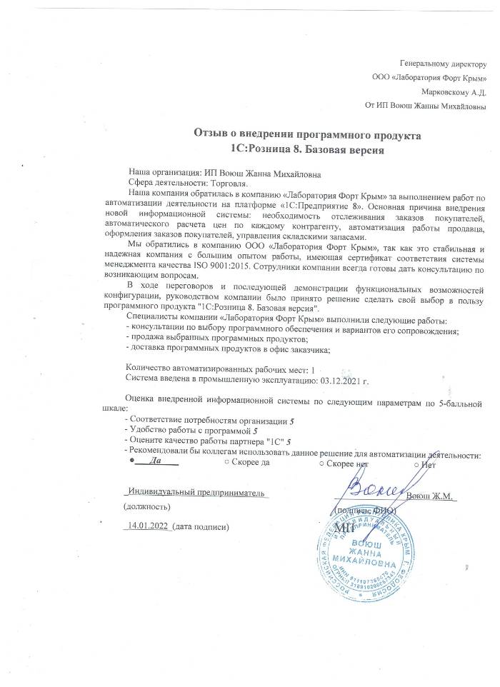 Индивидуальный предприниматель обратилась в компанию ООО «Лаборатория Форт Крым» и вкратце объяснила свои проблемы по ведению бизнеса. После консультации со специалистами, Жанна Михайловна приняла решение об использовании программного продукта «1С:Розница. Базовая версия».