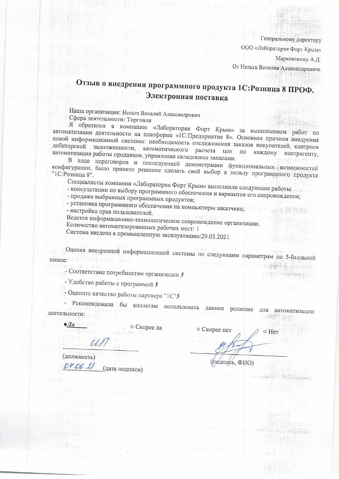 В результате внедрения у ИП Нельга Виталия Александровича все бизнес-процессы автоматизированы на базе программы «1С». В настоящее время работа с компанией ООО «Лаборатория Форт Крым» продолжается в рамках договора ИТС (информационно-технологическое сопровождение).