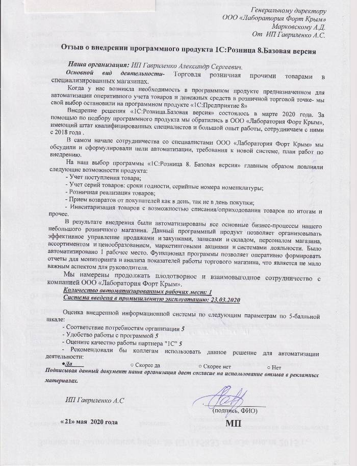 Сотрудники «Лаборатории Форт Крым» подробно проконсультировали нас, определили, что под нашу деятельность подойдет именно «1С:Розница 8», определились с необходимым торговым оборудованием, согласовали сроки подключения. Программный продукт установили специалисты «Лаборатории Форт», за регистрацией кассового аппарата в налоговом органе, подключением оборудования к 1С и по настройке рабочего места кассира (РМК), настройке пользователя мы также обратились за помощью к специалистам Форт Крыма.