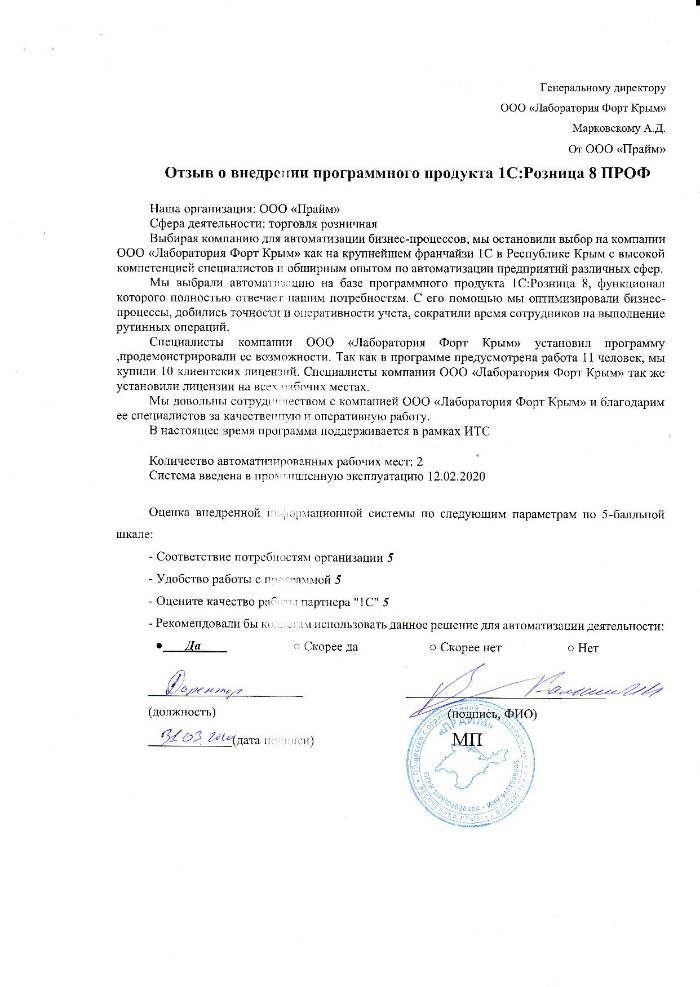 Руководство компании выражает благодарность специалистам ООО «Лаборатория Форт Крым» за выполненную работу и рекомендует компанию к сотрудничеству. На данный момент программа обслуживается в рамках договора на сопровождение.