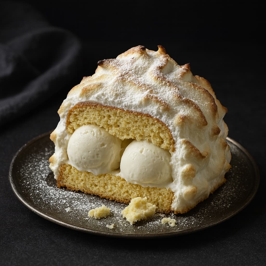 - Внешний вид: мороженое запечено на мельхиоровом блюде с ломтиками бисквита и сбитыми белками, посыпано при отпуске рафинадной пудрой..