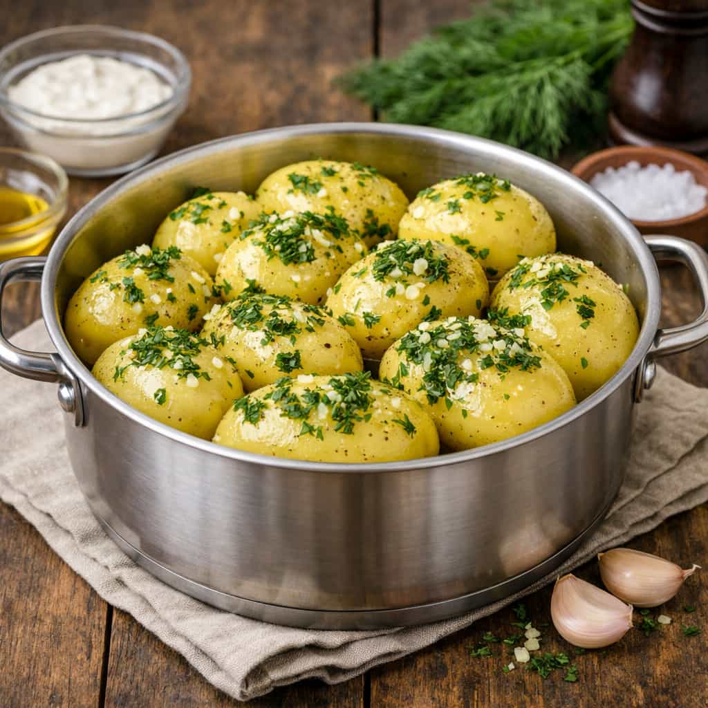 - Внешний вид: клубни картофеля сохранили форму или слегка разварились, без глазков и пятен, политы маргарином..
