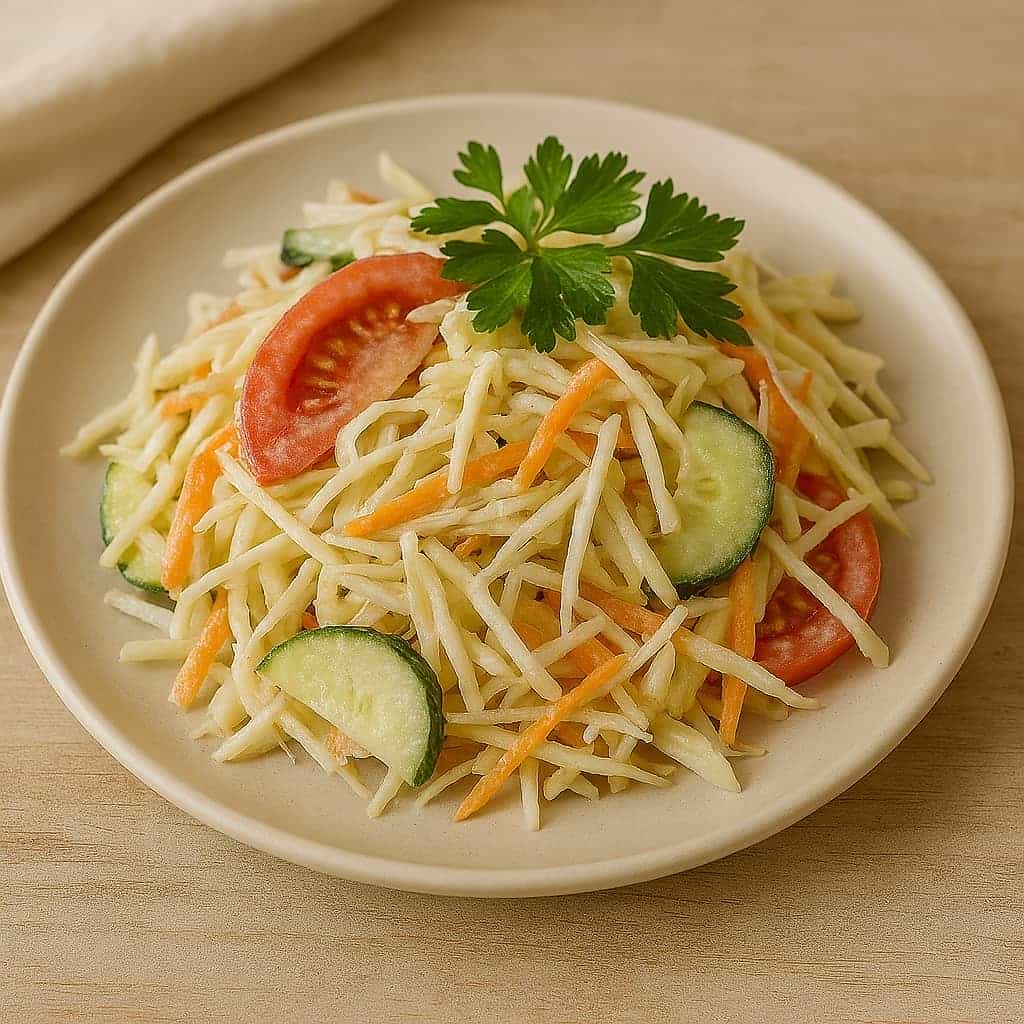 Подготовленные сырые морковь и репу, сельдерей или петрушку нарезают тонкой соломкой, свежие огурцы и помидоры-тонкими ломтиками, капусту шинкуют. Овощи перемешивают и при отпуске поливают сметаной или майонезом. В салат можно добавить нарезанный сладкий перец (10-15 г на порцию массой нетто), соответственно изменив выход порции.