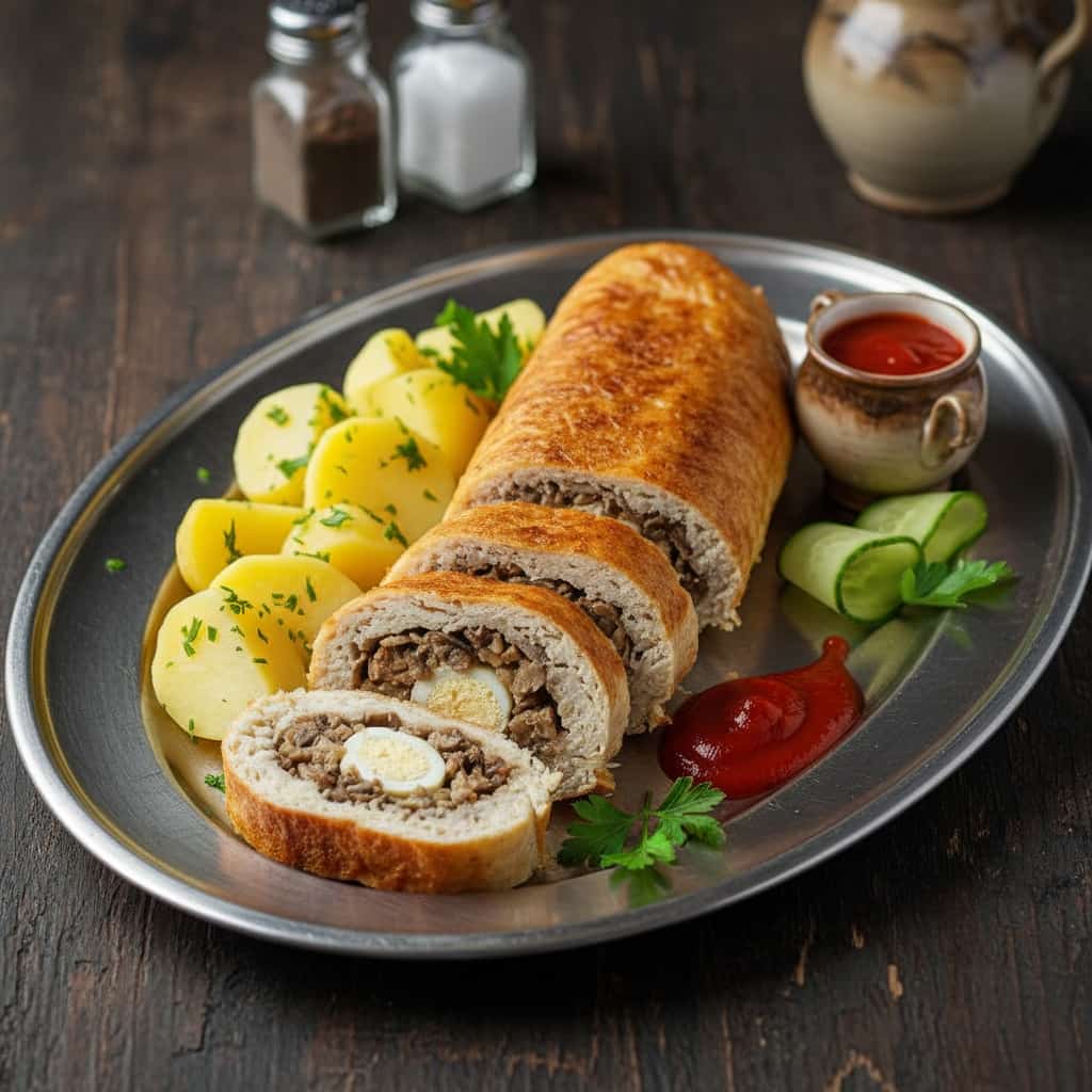 - Внешний вид: изделие в форме батона нарезано (по 2-3 кусочка на порцию) выложено на тарелку, рядом аккуратно размещен гарнир. Блюдо может быть оформлено зеленью. соус можно подать отдельно..