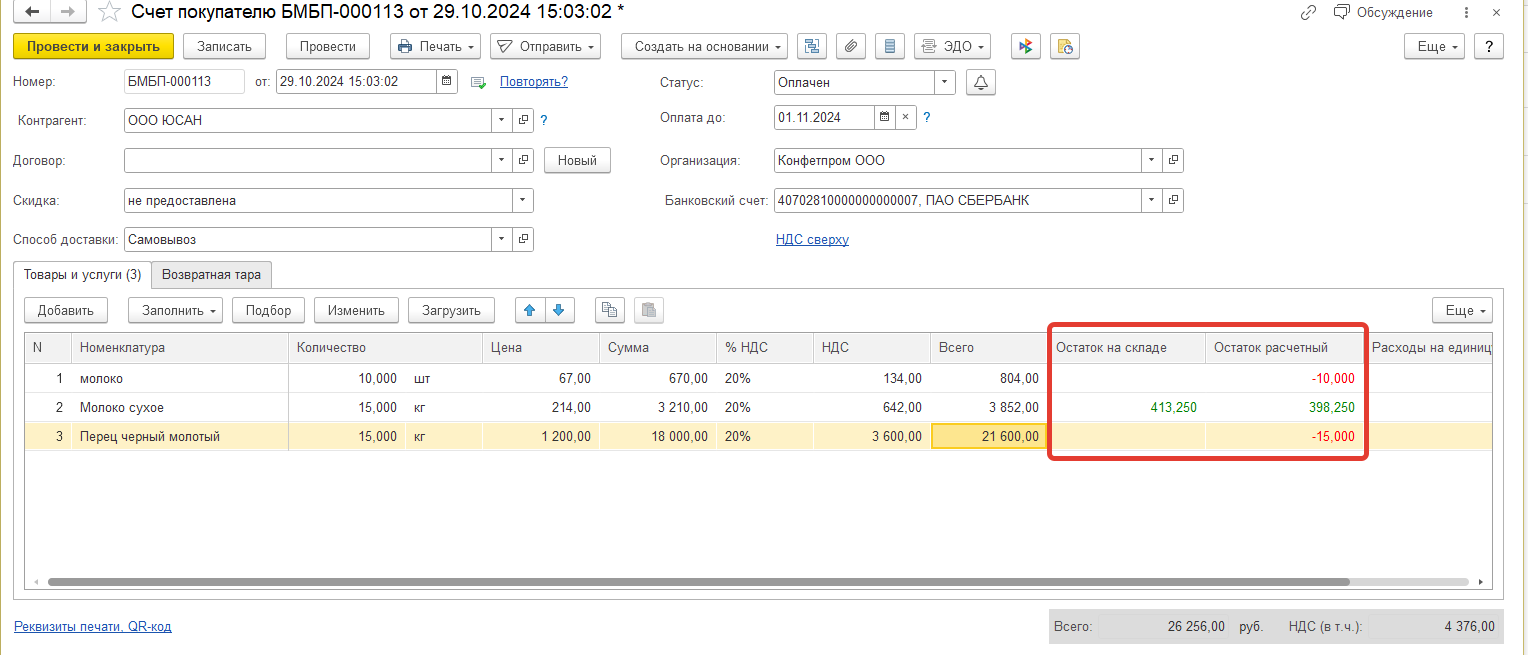 Расширение добавляет в табличную часть Товары документов «Счет покупателю» и «Реализация (акт, накладная, УПД)» колонки «Остаток на складе» и "Остаток расчетный", которые отражают количество товара, доступное для продажи.