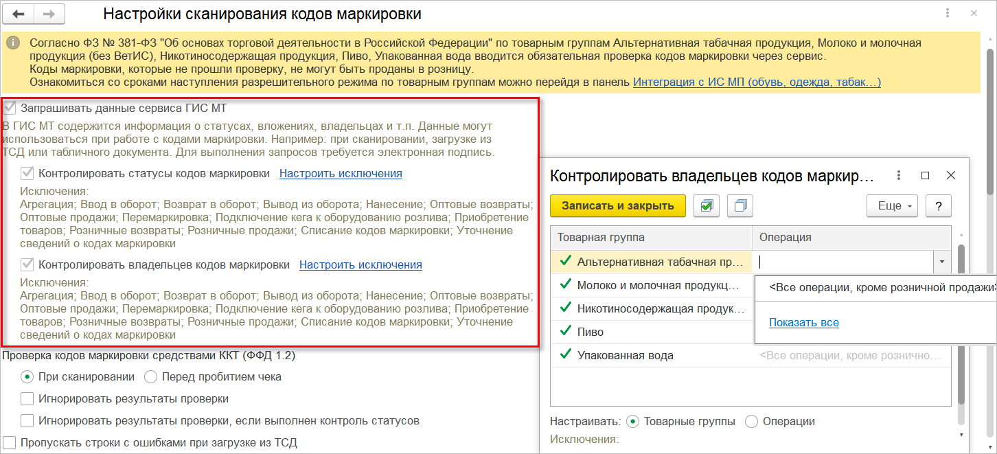 Необходимо в настройках Интеграции ИС МП выставить верные даты ввода разрешительного режима по категориям. А так же установить исключения по категориям и операциям.