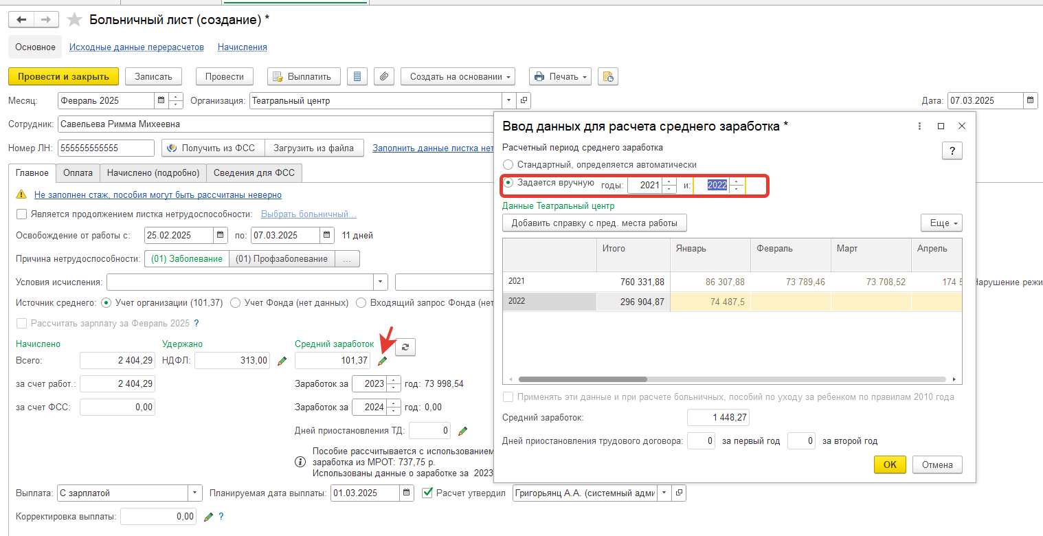 Необходимо в документе Больничный лист заменить данные по замене лет в разделе, нажав на зеленый карандаш и выбрав необходимый период по заявлению.