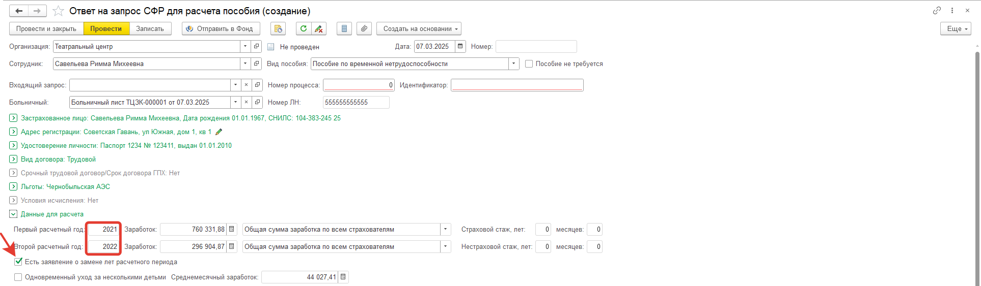 Как в ЗУП 3.1 отправить в СФР ответ за запрос ля рачета пособия с заменой лет, если сотрудница написала заявление?