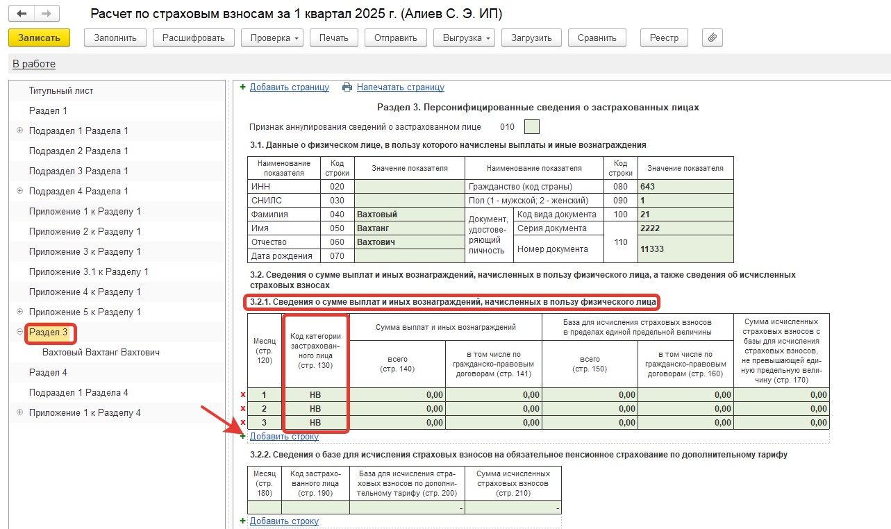 Из этого следует, что если руководитель не получает заработную плату, то при включении сведений о нем в раздел 3 по строке 130 указывается новый код "НВ", т.е. вручную добавить 3 строки и указать Код категории застрахованного лица- НВ.