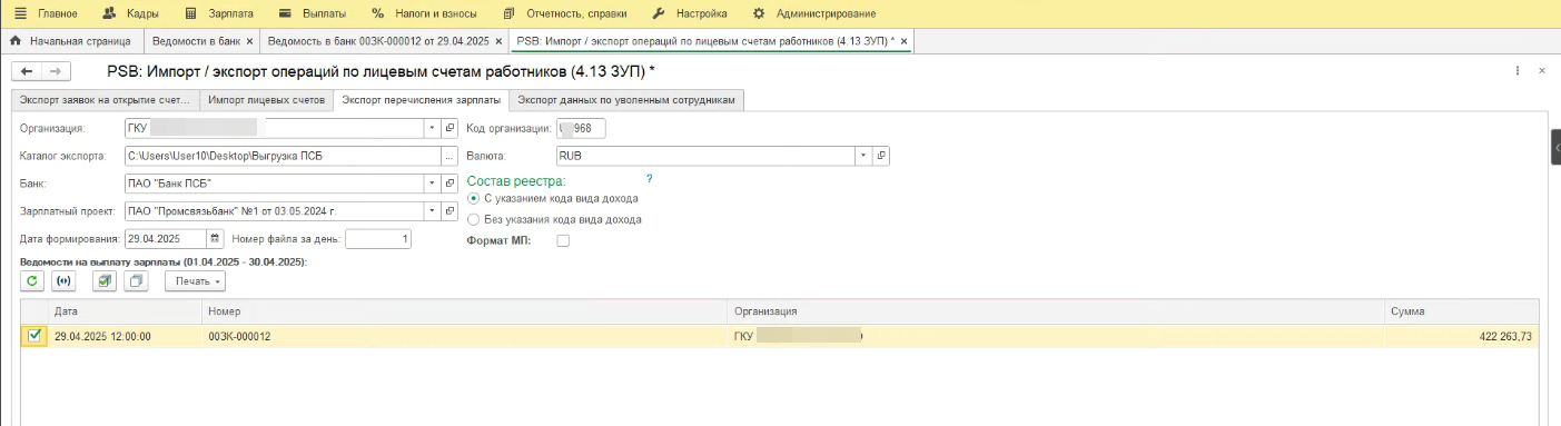 В ЗУП 3.1 есть возможность выгружать ведомости реестром в ПСБ- банк?