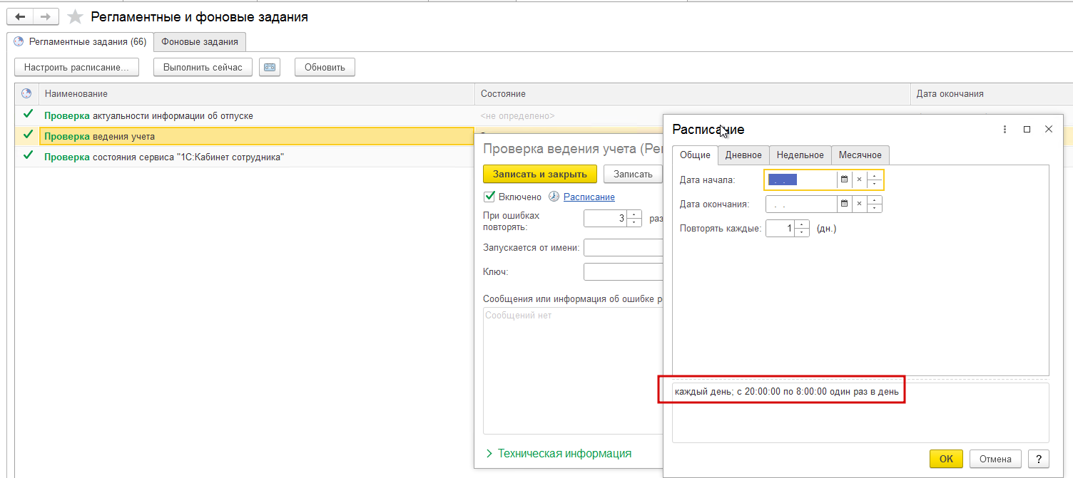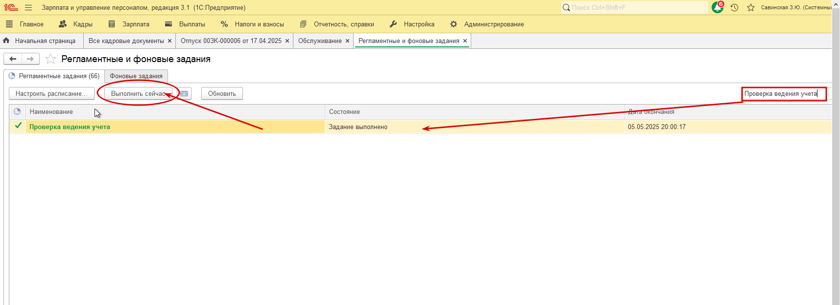 В открывшемся списке введите в поиск "Проверка ведения учета" и нажмите "Выполнить сейчас, выделив строку задания.