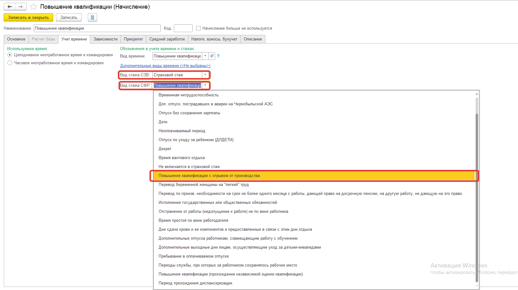Для того, чтобы в отчет заполнялся код КВАЛИФ, необходимо проверить настройки вида начисления Повышение квалификации (Настройка – Начисления) на вкладке Учет времени – параметр Вид стажа ПФР ![Отправили из ЗУП 3.1 отчет ЕФС-1 с типом сведений Назначение пенсии, пришел протокол с ошибкой: