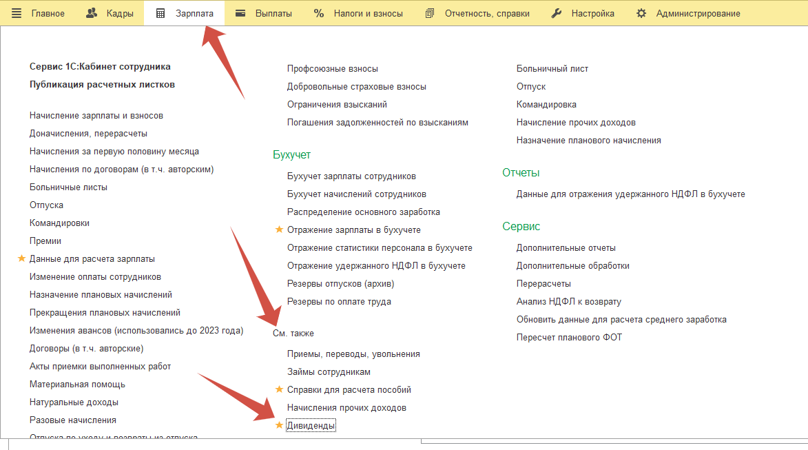 Начисление дивидендов оформляется в программе документом Дивиденды. Путь к документу: Зарплата-См. также-Дивиденды:
