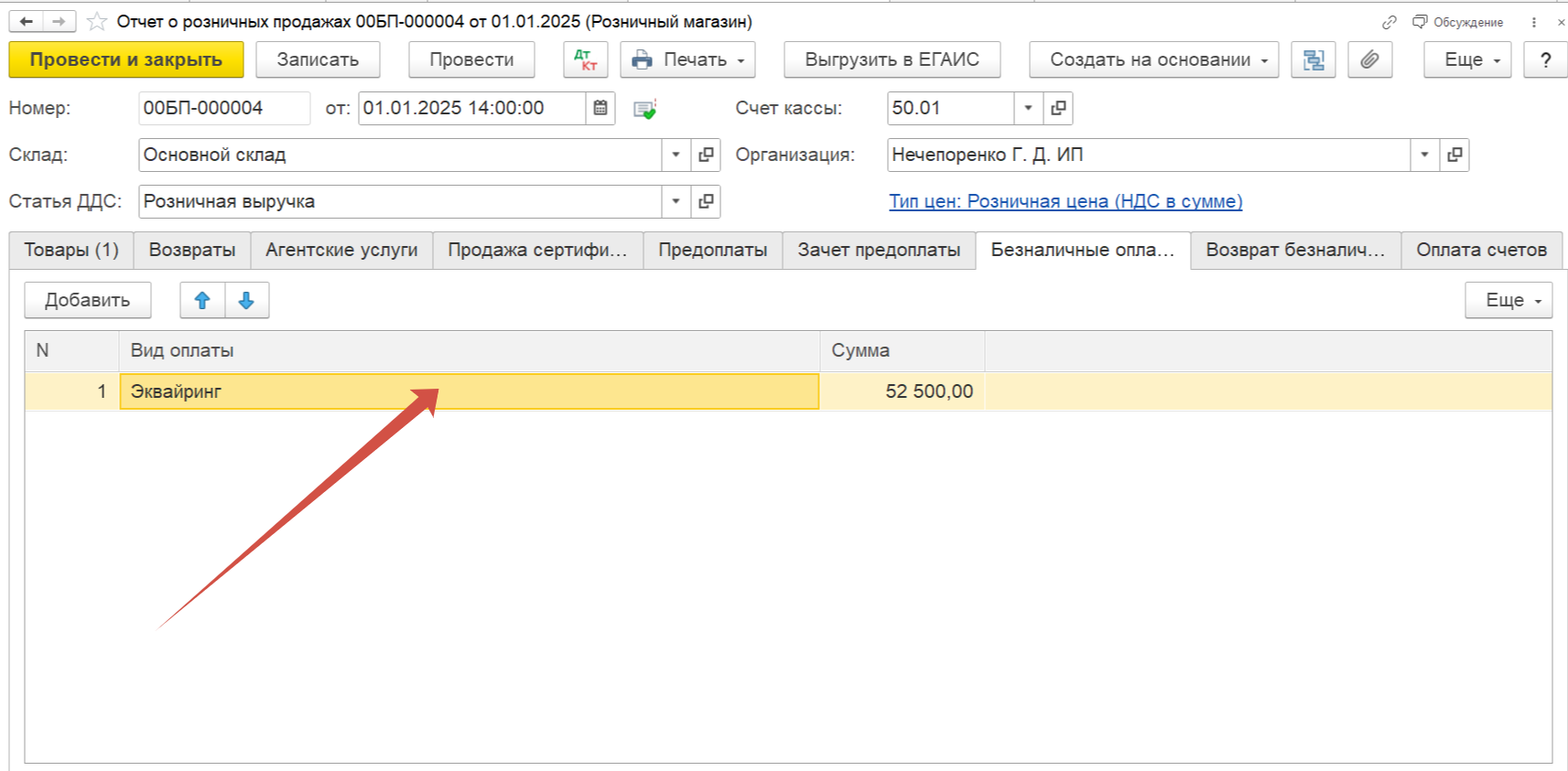 4. В поступлении на расчетный счет с видом Поступление по платежным картам должен стоять тот же договор. что и в Виде оплат во вкладке Безналичные расчеты в Отчете о розничных продажах.