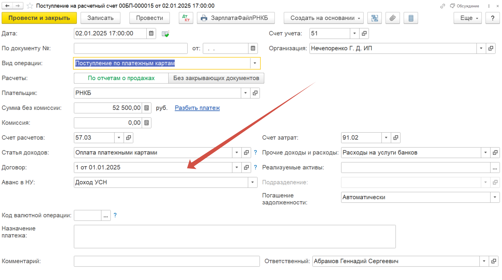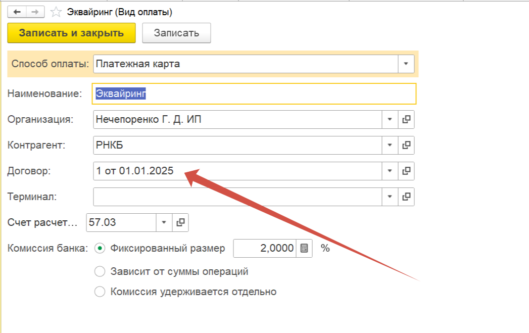 3. Во вкладке Безналичные оплаты должен стоять Вид оплаты, который создан в 2025 году и к нему подтянут также договор, созданный в 2025,чтобы программа не учитывала предыдущие взаиморасчеты.