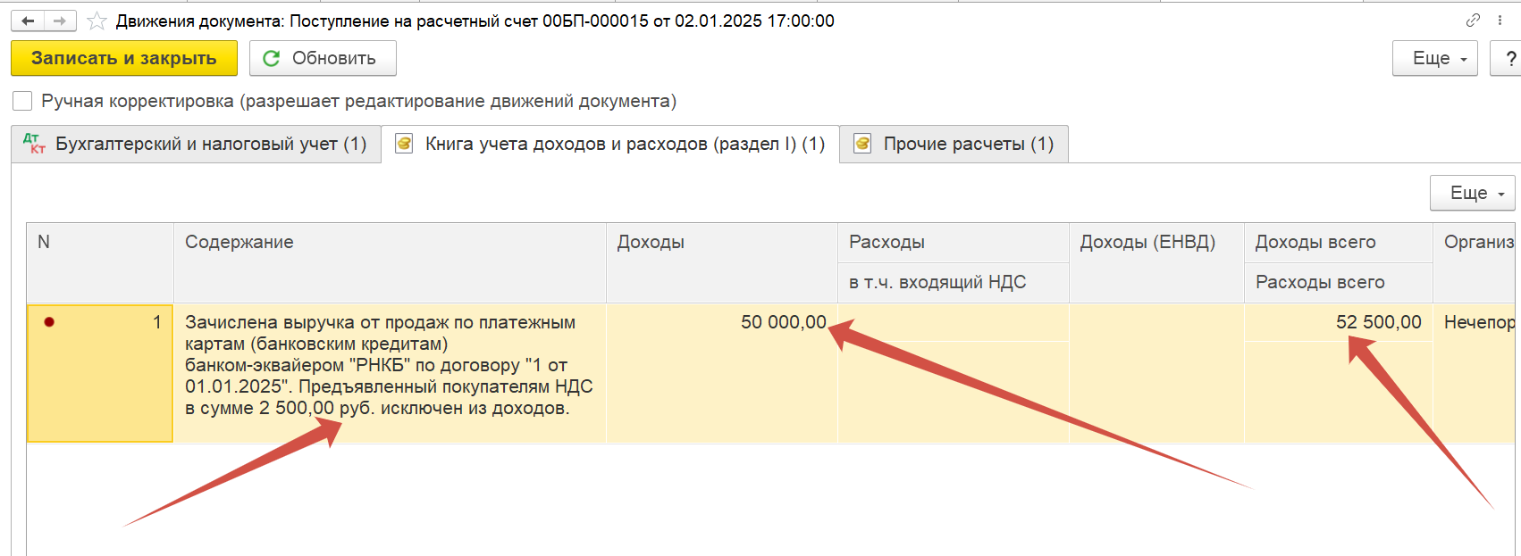 5. При соблюдении всех вышеперечисленных условий в проведенном документе Поступление на расчетный счет будет исключаться сумма НДС из дохода УСН.