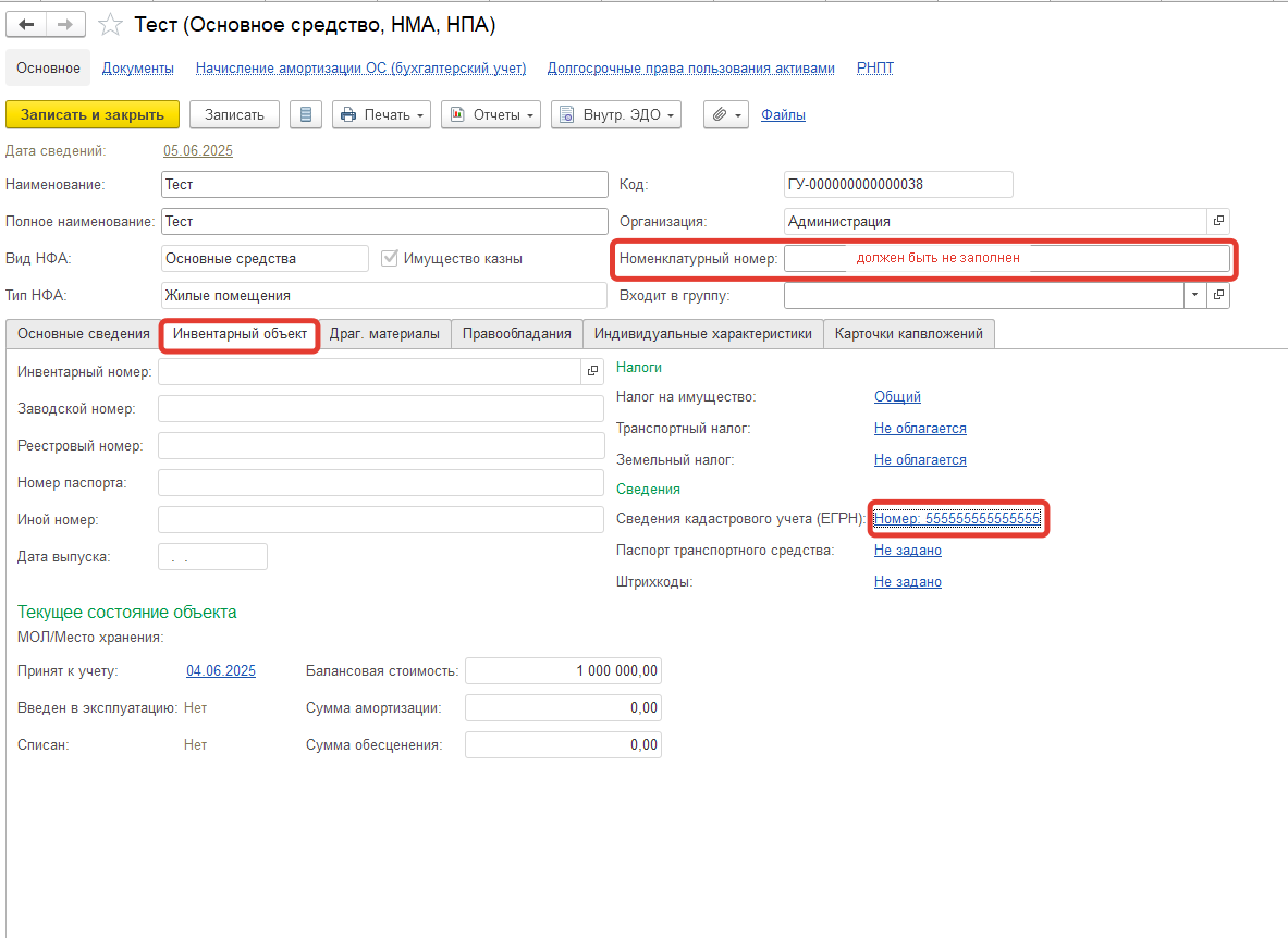 Для указания кадастрового номера для основного средства необходимо из формы справочника основного средства перейти на закладку "Инвентарный объект" в группу "Сведения" и перейти по гиперссылке "Сведения кадастрового учета (ЕГРН)".