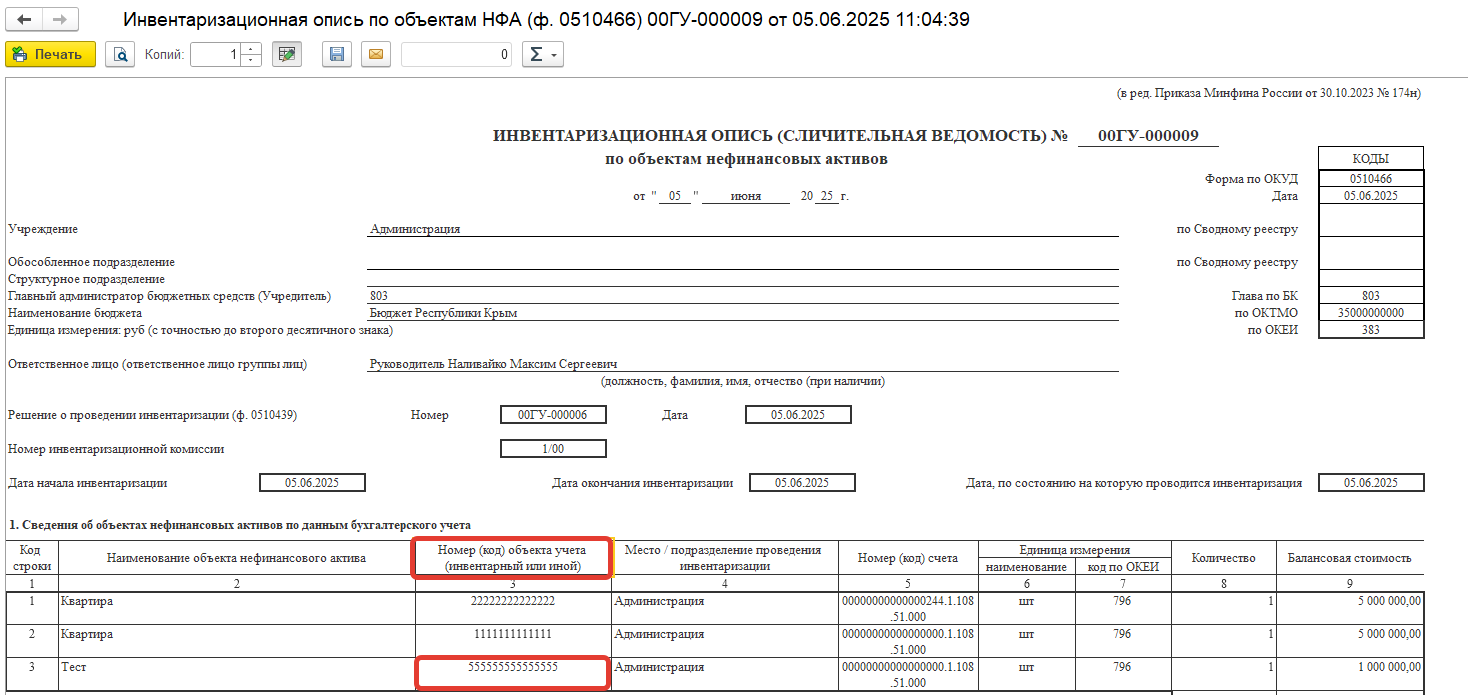 Как в БГУ 2.0 настроить так, чтобы в печатную форму Инвентаризационной описи ф. 0510466 по инвентаризации имущества казны в колонку 3 (Номер (код) объекта учета (инвентарный или иной)) заполнялись данные по кадастровому номеру, т.к.в учреждении не ведется инвентарный учет для имущества казны?