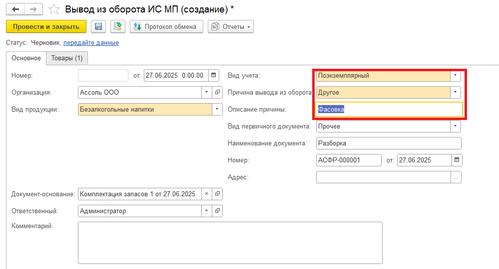 До 01.09.2025 после первого факта продажи такой продукции, в течении трех дней вам необходимо создать документ «Вывод из оборота» с причиной вывода из оборота «Прочее», и описанием причины «Фасовка»