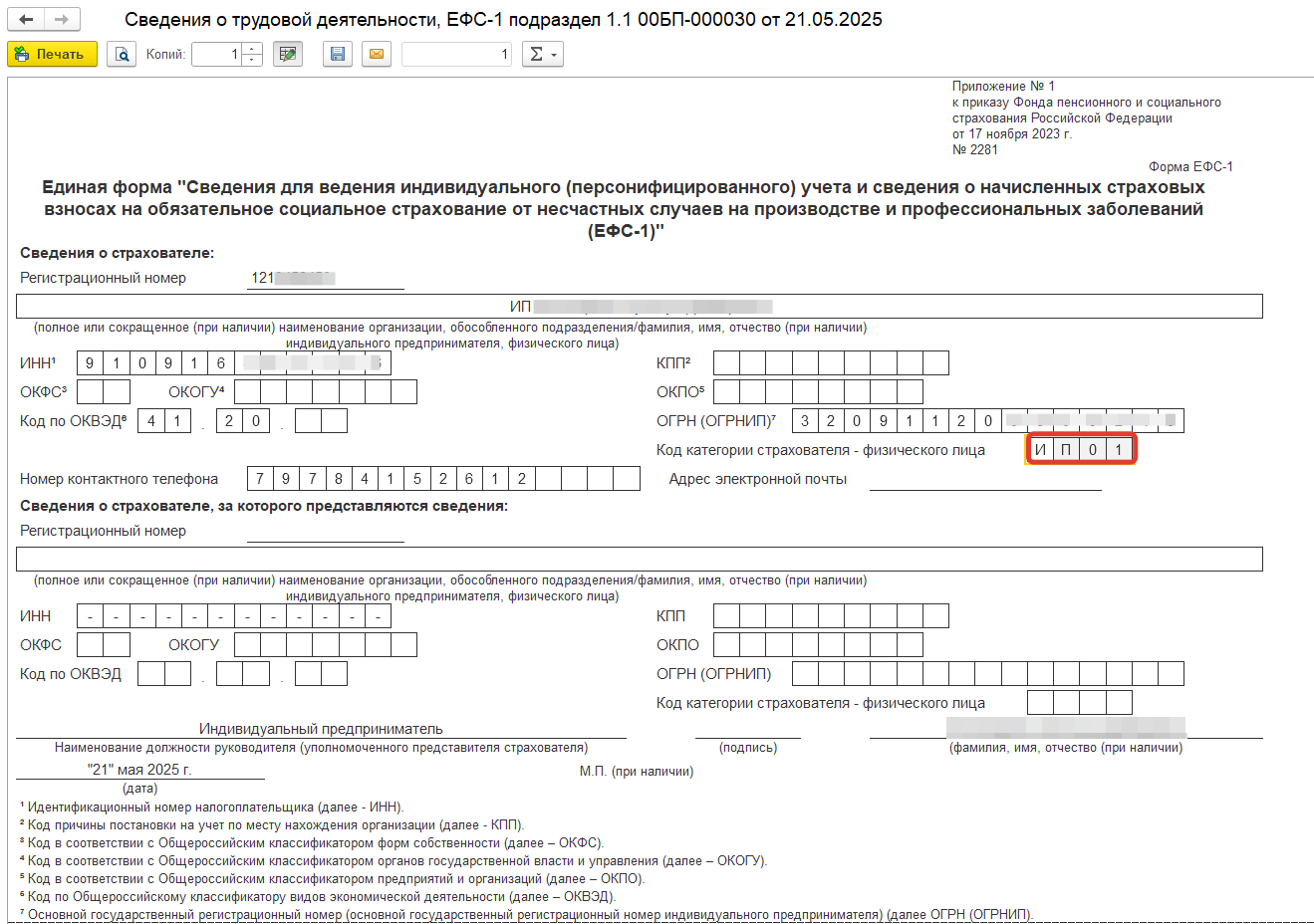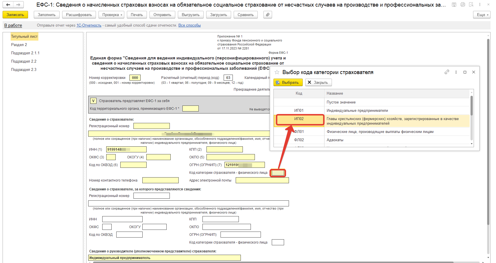 Для формирования и отправки отчета ЕФС-1: Сведения о начисленных страховых взносах на обязательное социальное страхование от несчастных случаев на производстве и профессиональных заболеваний с вышеуказанным кодом необходимо на титульной странице отчета выбрать код ИП02 из выпадающего списка в ячейке Код категории страхователя - физического лица.