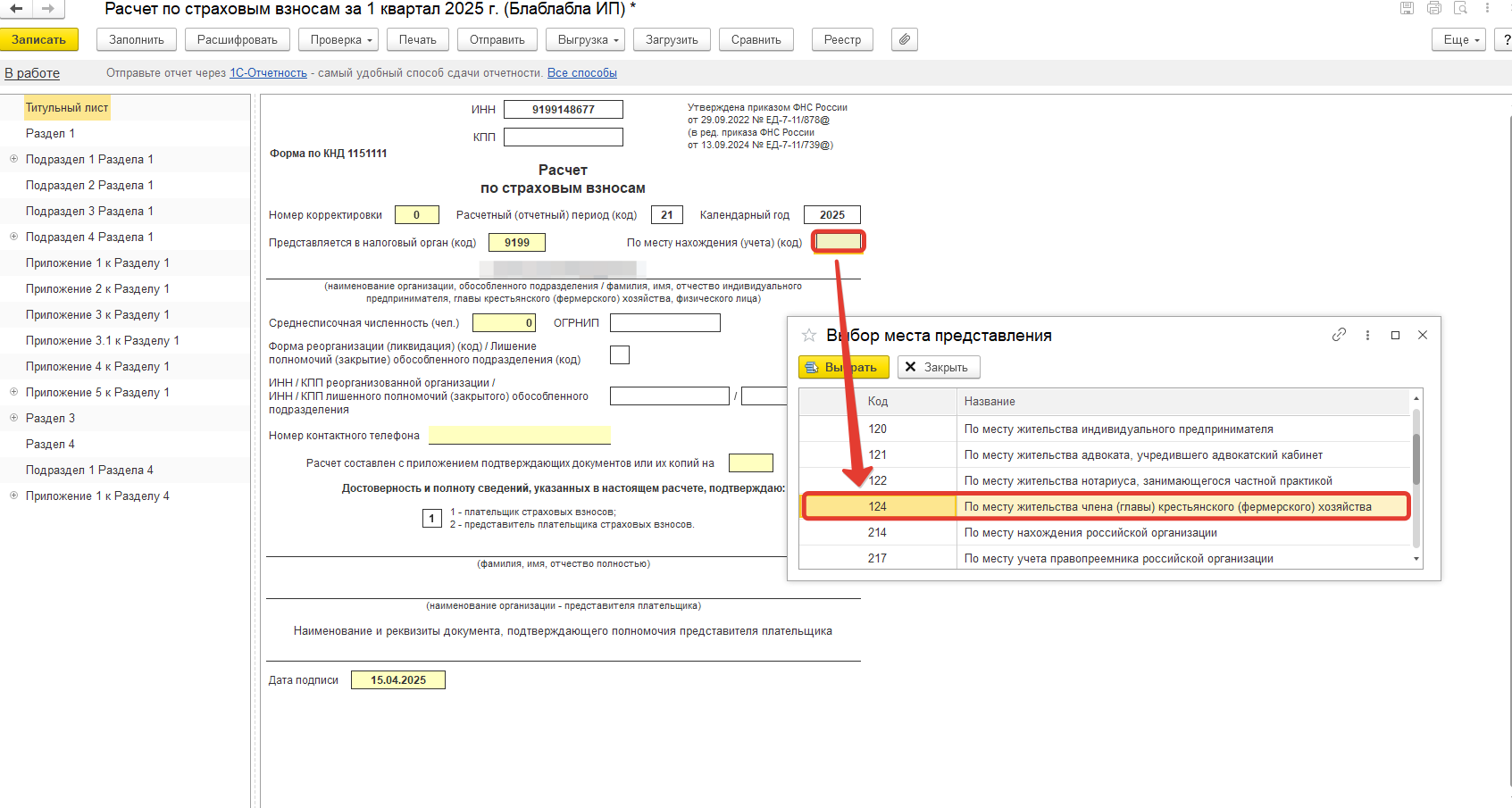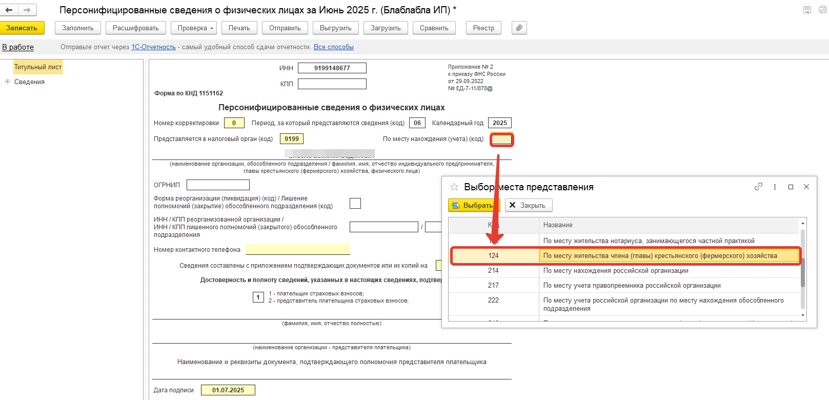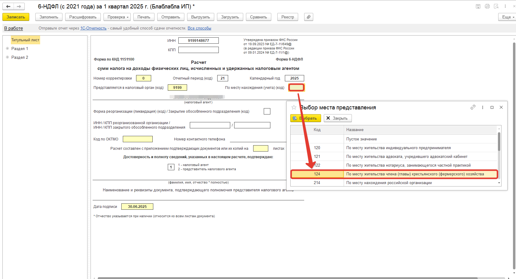 В отчетах 6НДФЛ, РСВ и Персонифицированные сведения необходимо выбрать в ячейке По месту нахождения (учета) (код) 124 - По месту жительства члена (главы) крестьянского (фермерского) хозяйства.