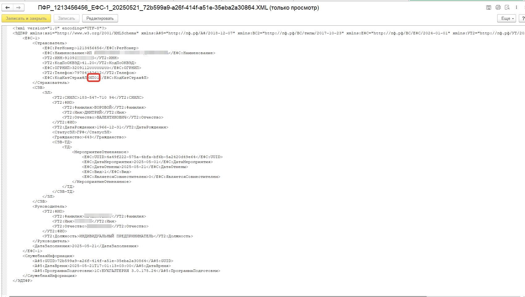 Таким образом, установить код ИП02 в отчет ЕФС-1 подраздел т.1 можно только ручной корректировкой xml-файла отчета.