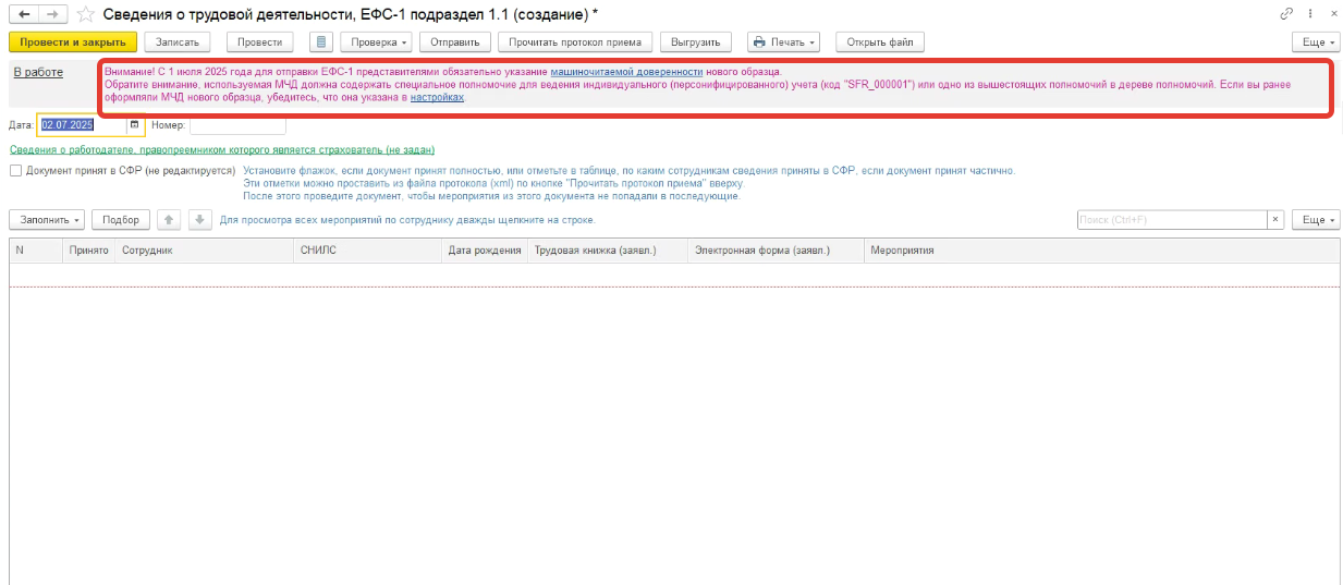 При подаче формы ЕФС-1 будет действовать новый порядок: больше не принимаются устаревшие форматы подтверждения полномочий — вместо них потребуется машиночитаемая доверенность (МЧД), оформленная по формату СФР. Это связано с переходом на Единую централизованную цифровую платформу в социальной сфере (ГИС ЕЦП), где такие доверенности обязательны.