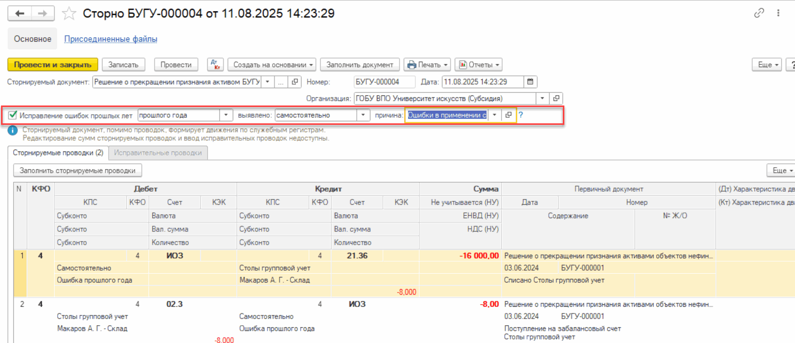 Если Решение о прекращении признания активом было введено ошибочно по указанным объектам, тогда его можно сторнировать через исправление ошибок прошлых лет, сформировав на его основании документ Сторно.