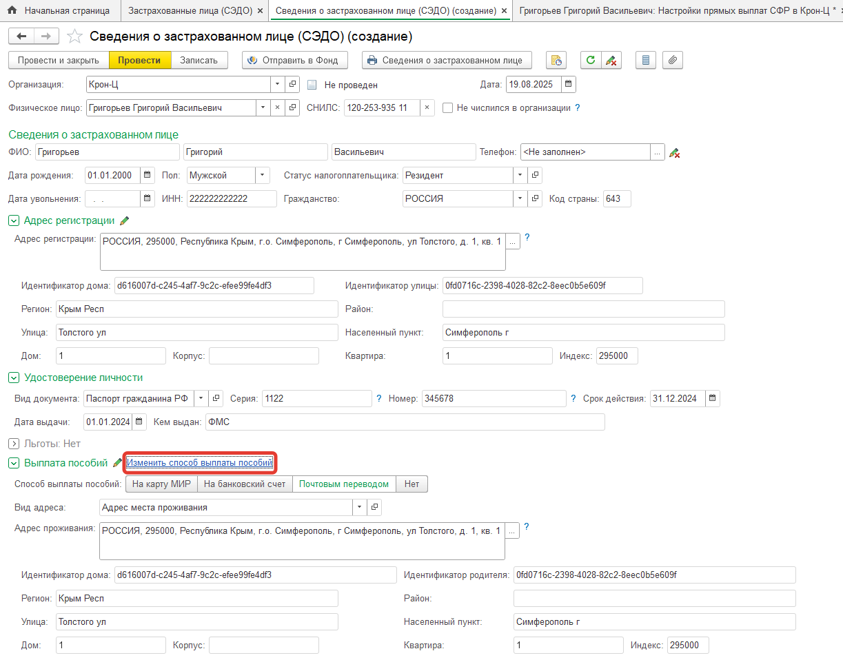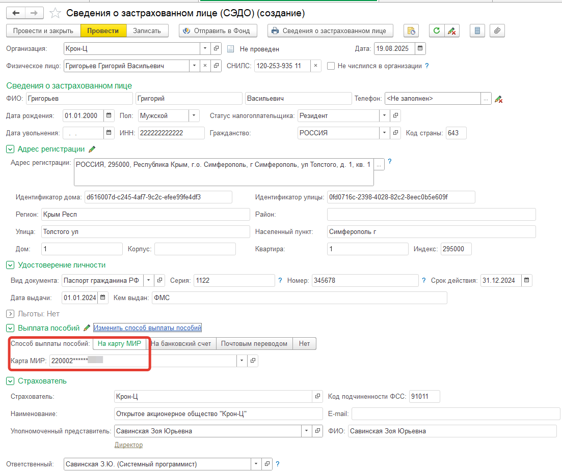 Осталось Провести и Отправить Сведения о застрахованном лице в СФР.