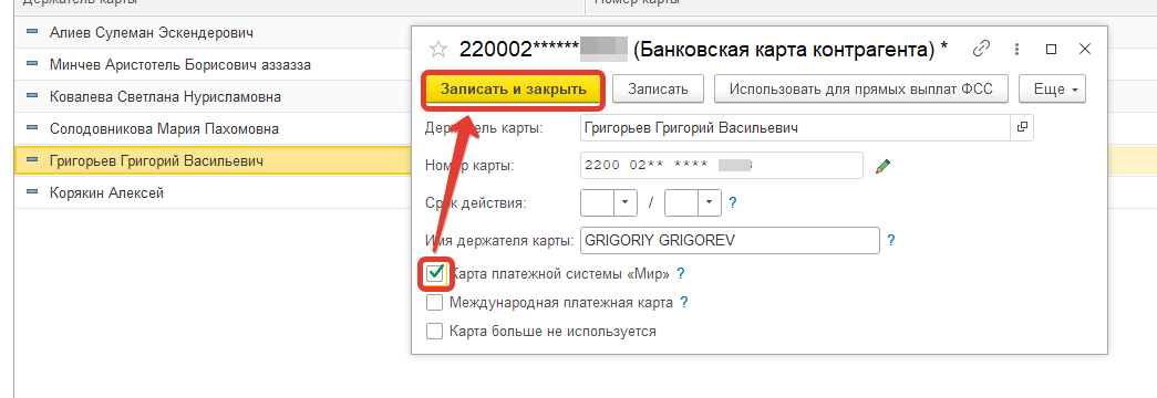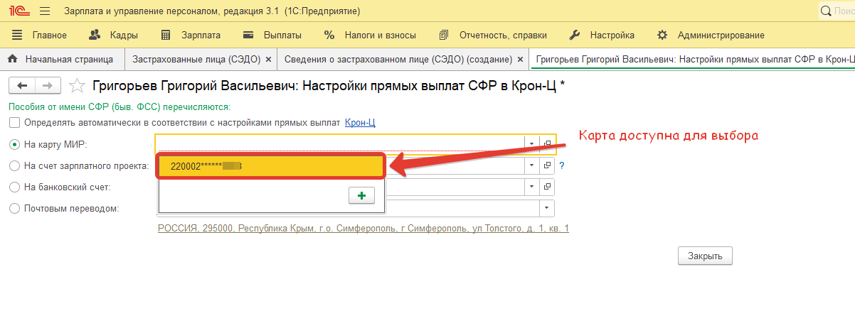 Теперь вернемся в карточку сотрудника и установим способ выплаты На карту МИР.