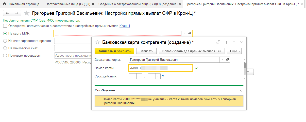 При анализе ситуации действительно выявлен отказ программы от подтягивания карты МИР при смене способа выплаты в документе Сведения о застрахованном лице.