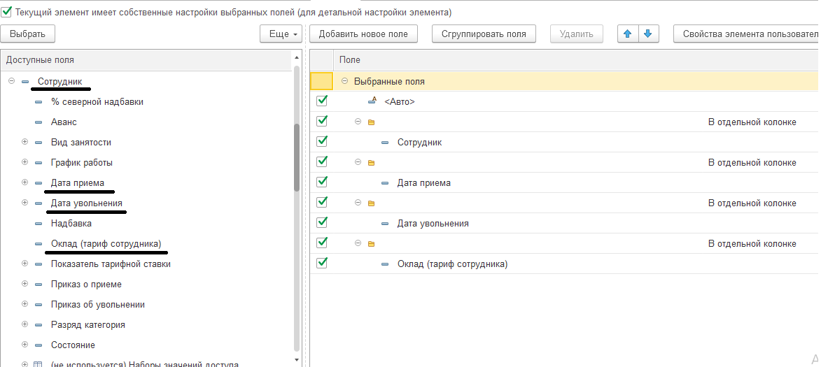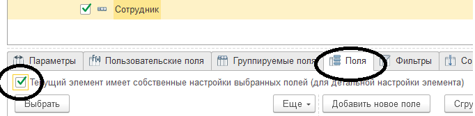 Нажать на строку "Сотрудники" - зайти в графу "Поля" - нажать флаг "Текущий элемент имеет собственные настройки выбранных полей"