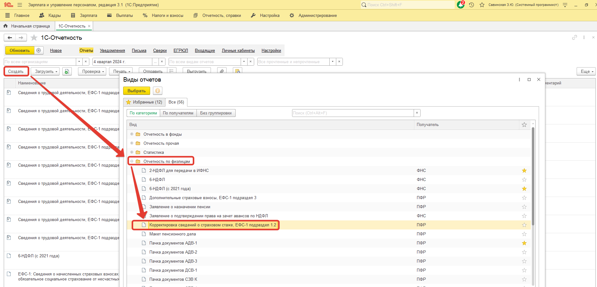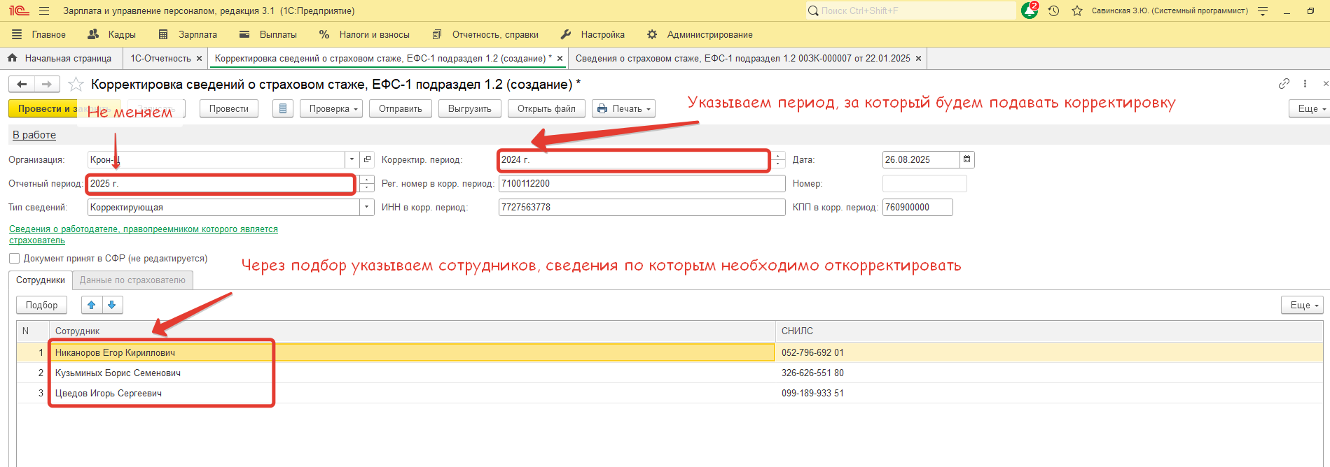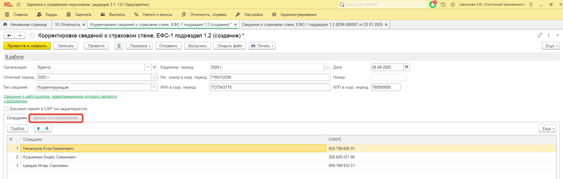 Сформируем корректировочный отчет по форме Корректировка сведений о страховом стаже, ЕФС-1 подраздел 1.2.