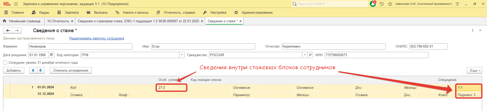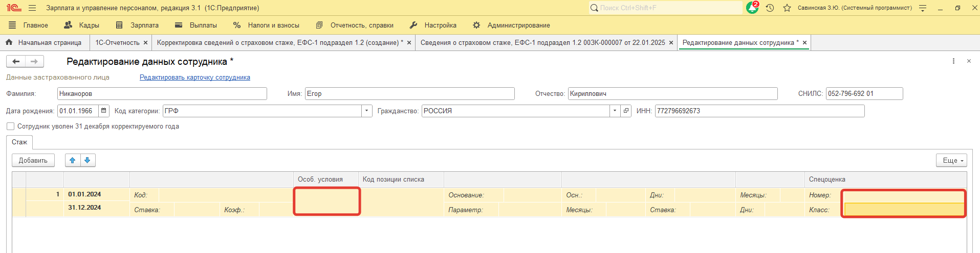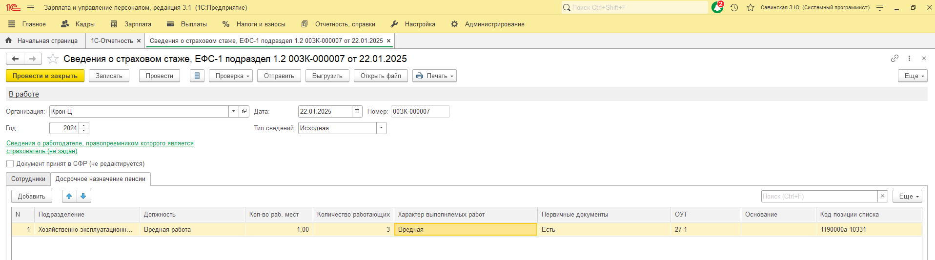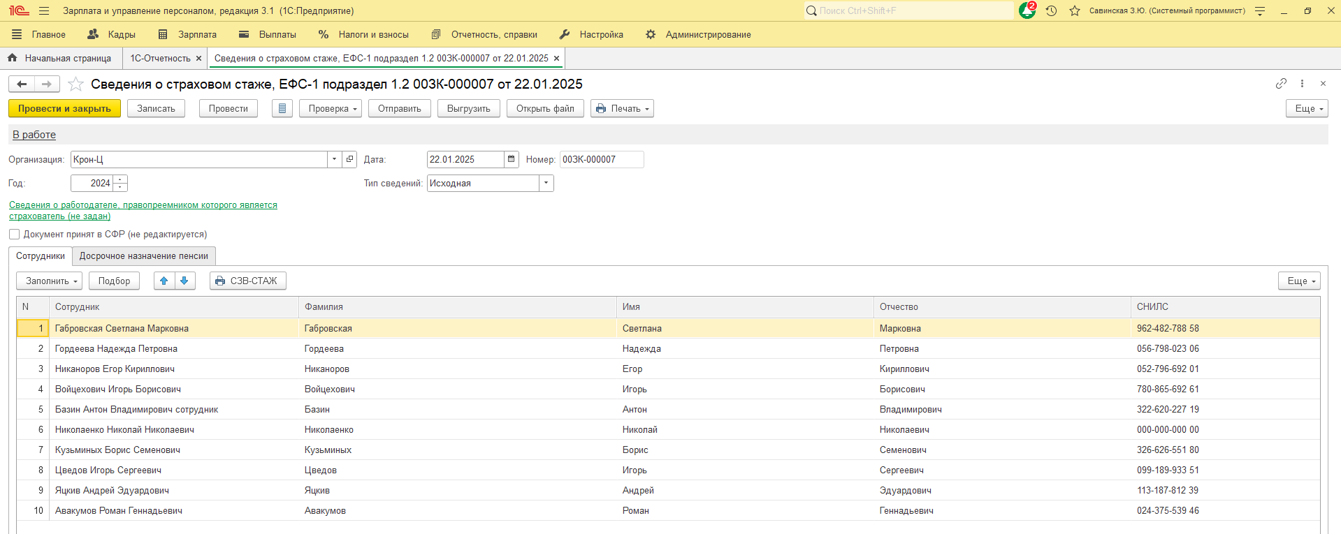 Сформируем корректировочный отчет по форме Корректировка сведений о страховом стаже, ЕФС-1 подраздел 1.2.