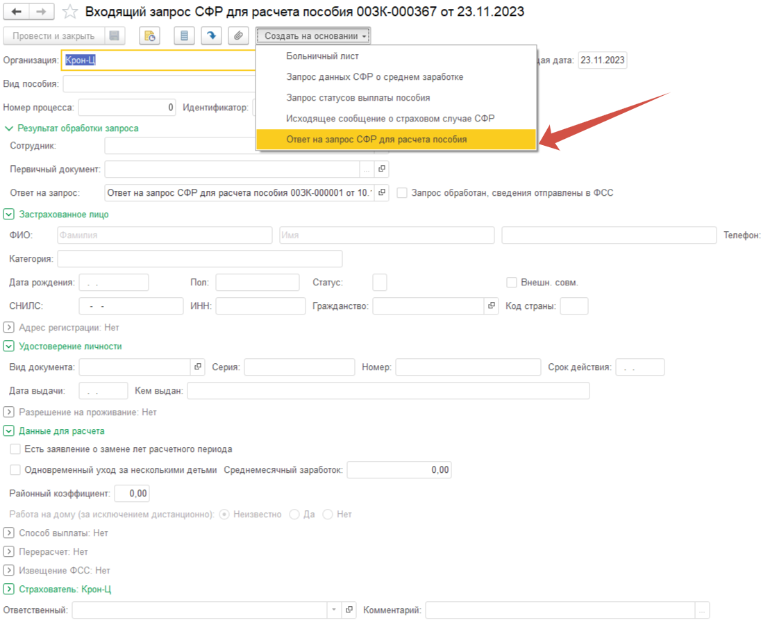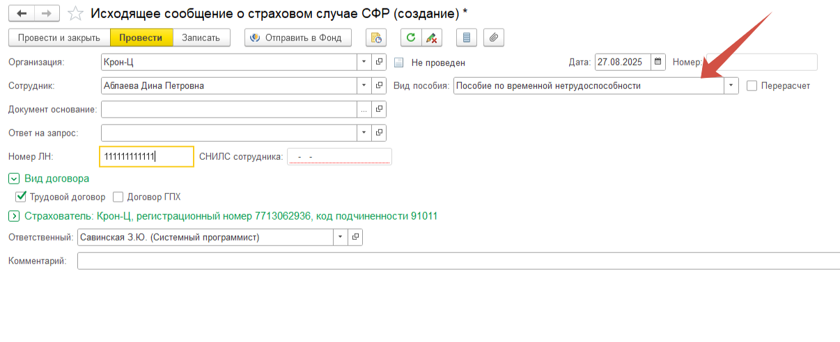 2. После получения положительного протокола о том, что ответ Принят фондом, направить инициацию по больничному листу по основному месту работы сотрудника Исходящее сообщение о страховом случае.