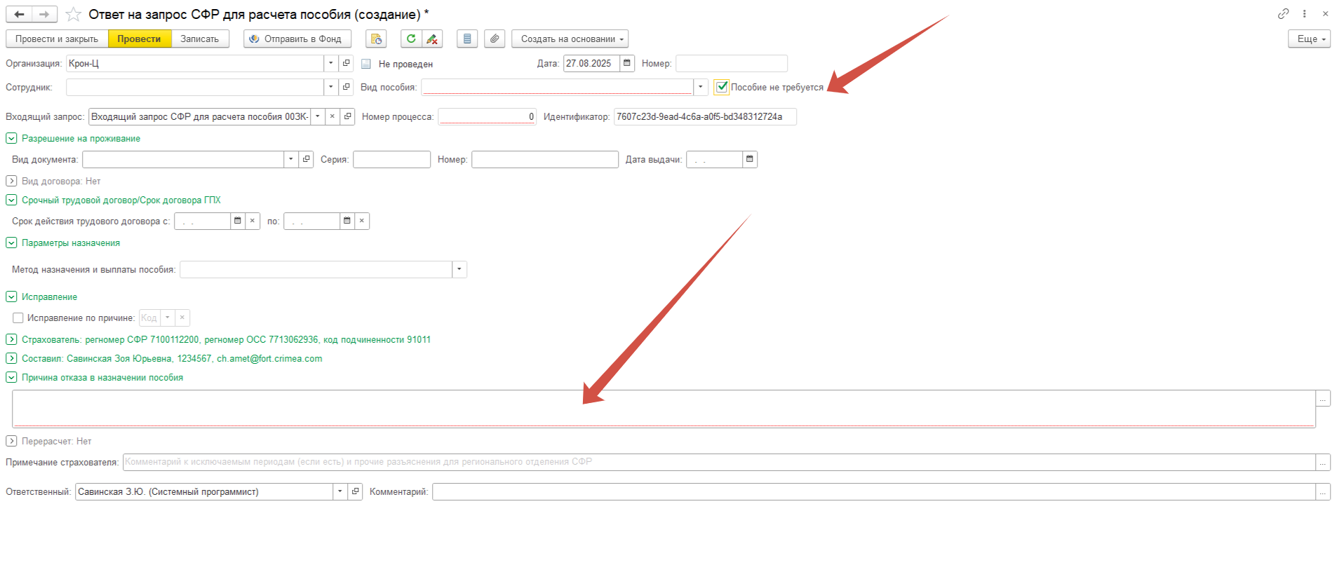 1. Необходимо отправить ответ на Входящий запрос по больничному листу совместителя с установленным флагом, что Пособие не требуется. Также необходимо заполнить причину отказа от пособия в поле Причина отказа от назначения пособия. Здесь нужно указать, что совместитель не работает на предприятии в течение 24 месяцев. Будет инициирован проактивный процесс по основному месту работы.