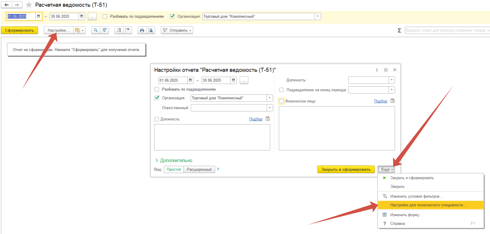 1. Идем в настройки отчета, выбираем Настройки для технического специалиста.
