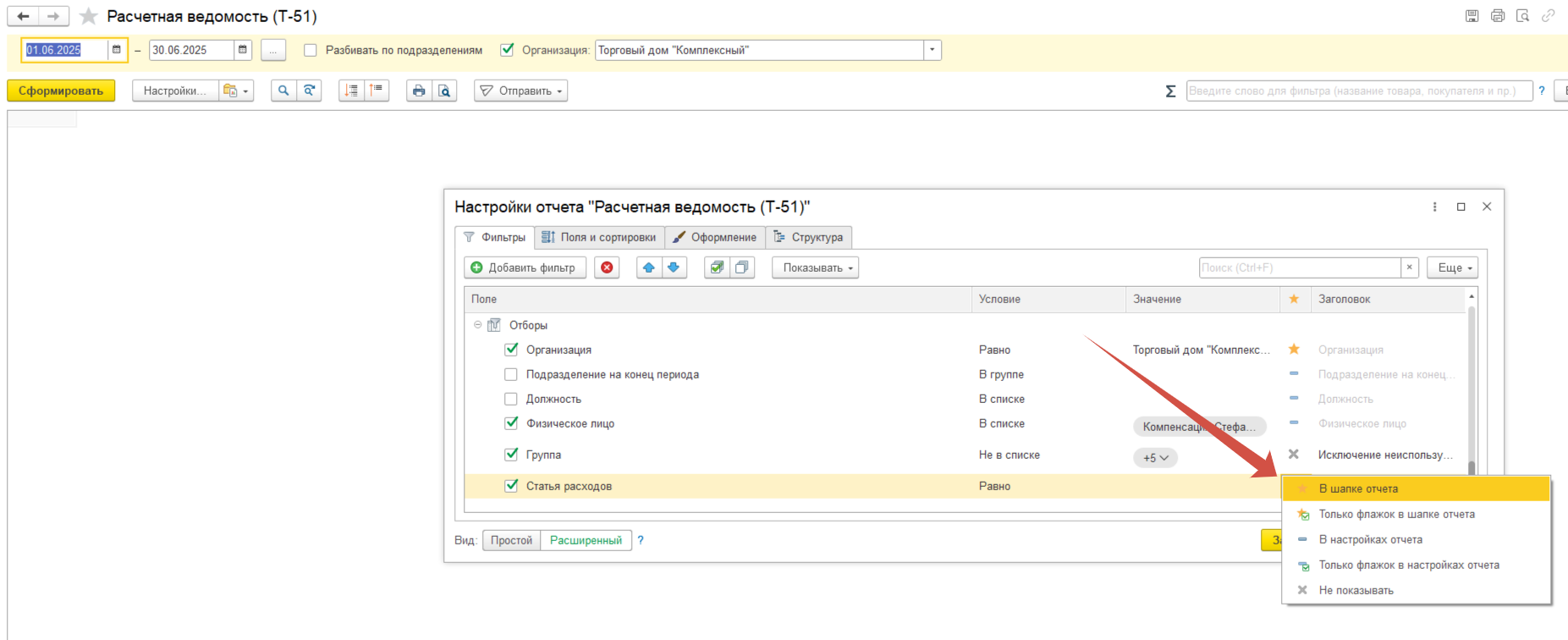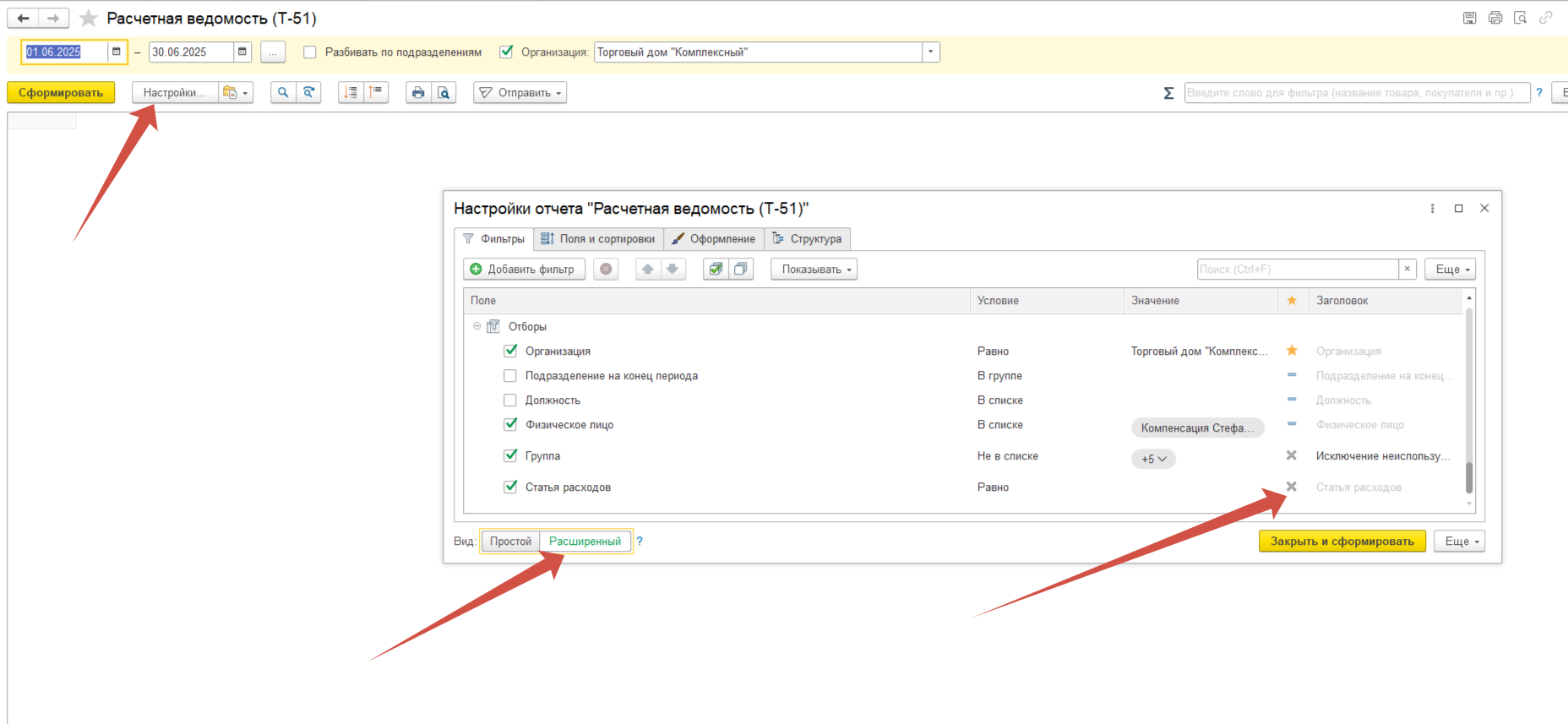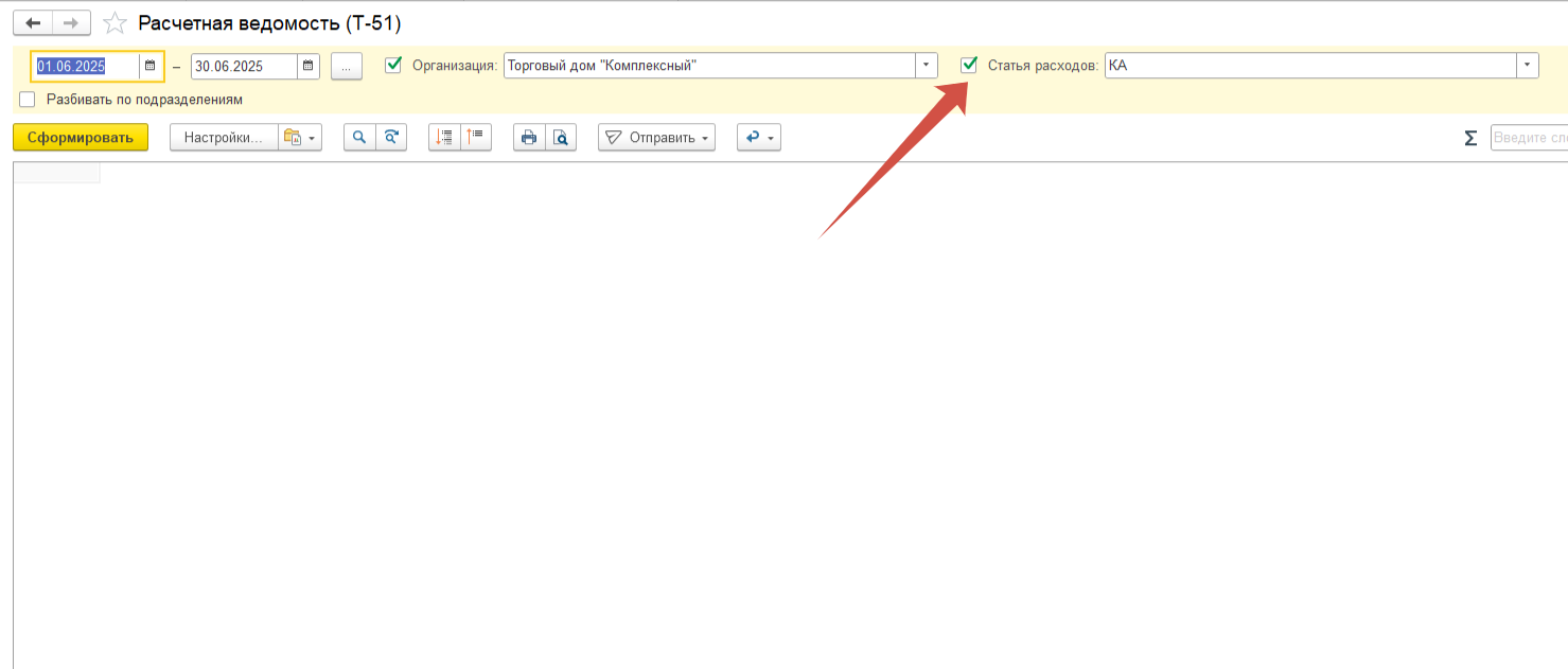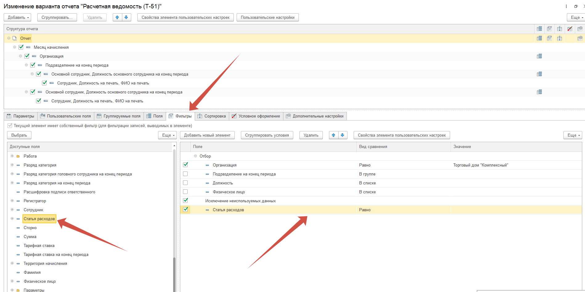 Как настроить расчетно-платежную ведомость Т-51 с отбором по статье расходов.