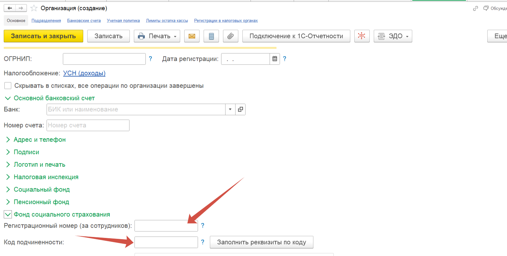 Ввести полученный номер и код в карточку организации и записать ее.