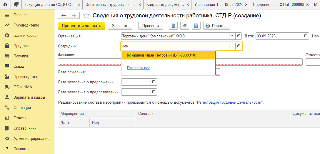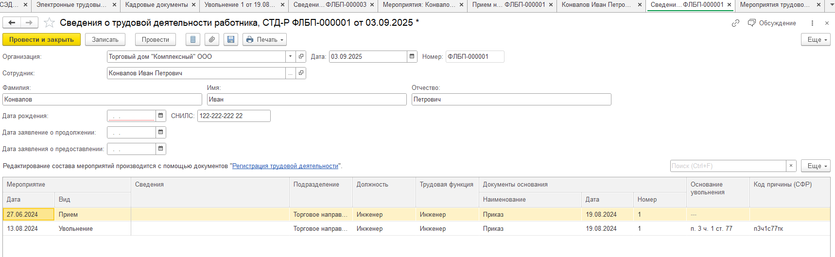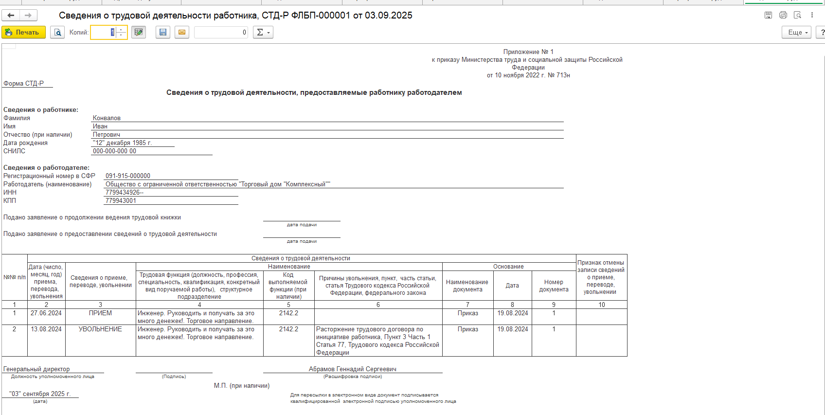 Справка СТД-Р относится к пакету документов, выдаваемых работодателем при увольнении в обязательном порядке, и включающая сведения о кадровых мероприятих только по данному работодателю. Формируется из учетных программ работодателя в разделе Электронные трудовые книжки, и включает в себя все кадровые мероприятия, по которым были сформированы отчеты ЕФС-1 подраздел 1.1.