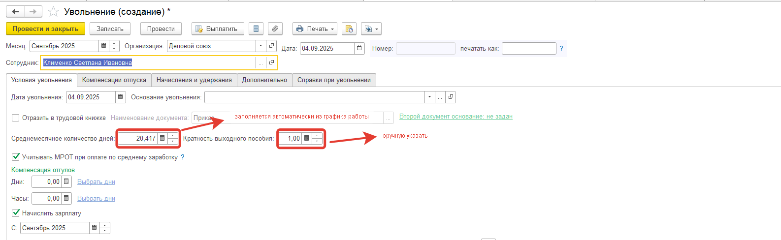 Для этого в документ Увольнение с Датой увольнения начиная с 01.09.2025 на вкладку Условия увольнения добавлены новые поля:
