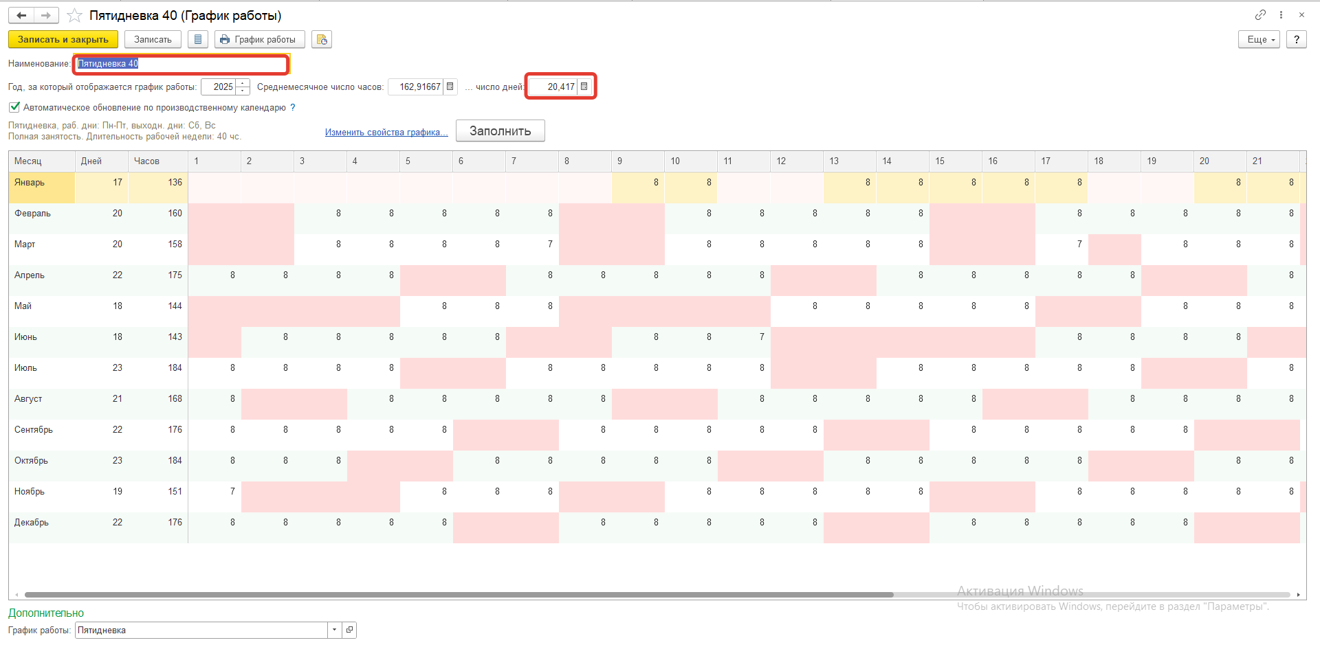 - Среднемесячное количество дней (часов) – поле заполняется в программе автоматически согласно Графику работы сотрудника;
