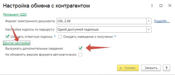 В открывшемся окне развернуть Другие настройки и поставить флаг напроти Выгружать дополнительные сведения