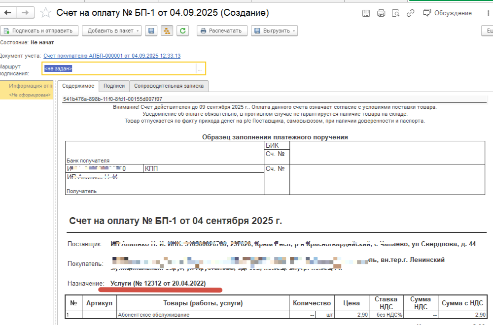 При формировании электронного документа Счет покупателю поле Назначение не заполняется